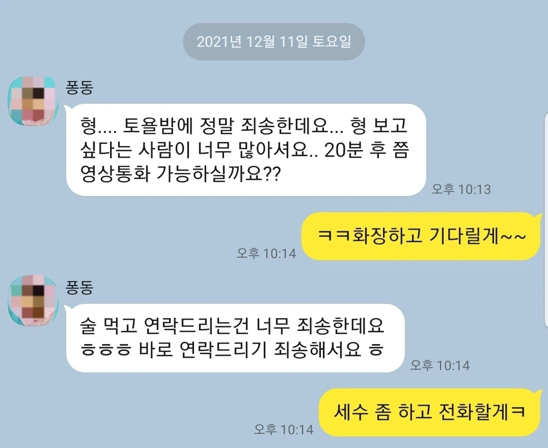 “형... 토요일 밤에 정말 죄송한데요. 형 보고 싶다는 사람이 너무 많아서요... 20분 후쯤 영상 통화 가능할까요?”