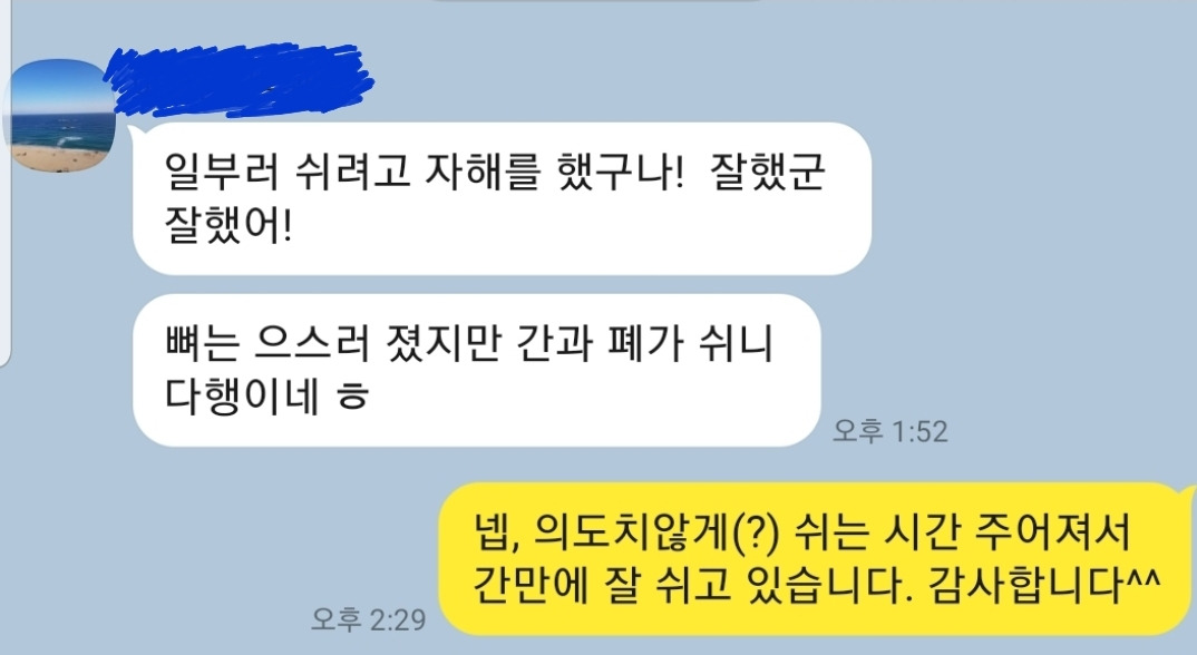 일견 맥락없에 보이는 츤데레 B형님의 카톡은 내 건강상태의 맥을 제대로 짚어주었다. 진정한 치료는 마음의 치료라고 했던가?그동안 누적된 피로가 한거풀 벗겨지는 기분이었다.