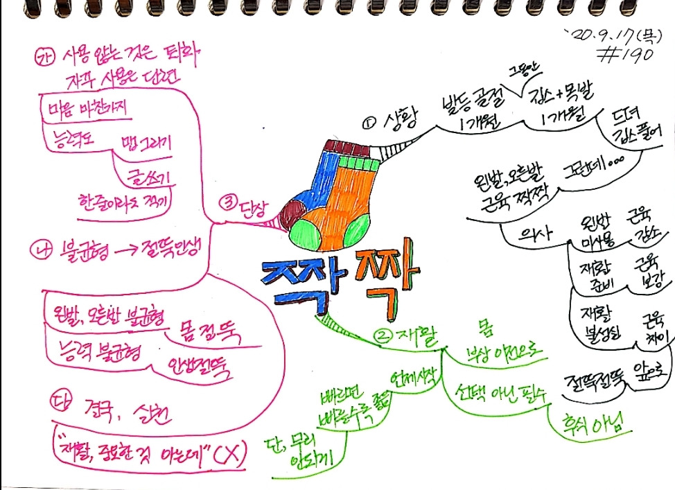 어찌 몸만 그럴까. 사람의 마음도. 자신이 키우고 싶은 능력도. 이를테면 글쓰기 같은. 건강해야지, 재활치료 잘 받아야지 하는 생각은 다리 근육을 키워주지 않는다. 누워서 뻐근해질정도로 다리를 천천히 들어 올렸다가 내려놓는 그 한 번의 동작이 중요하다. 글쓰기도 마차가지. 종이에 또는 핸드폰 메모장에 내 생각을 한 줄이라도 적어보는 그 행동이 글쓰기 근육을 키우는데 도움이 될 듯하다.
