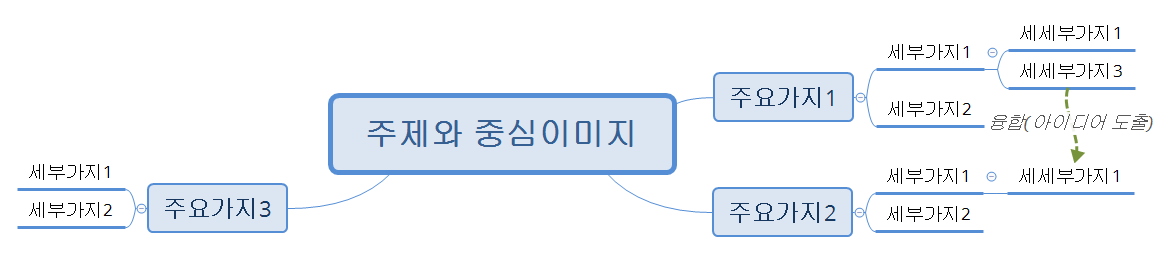 마인드맵은 나무에 비유할 수 있다. 마인드맵에서 중요한 요소는 3가지다. 주제와 중심 이미지, 주요 가지, 세부 가지. 내가 가진 수많은 생각들은 나무의 ‘뿌리’라 할 수 있다. 여러 생각 중 하나의 '주제와 중심 이미지'가 나무의 ‘줄기’다. 그 줄기에서 첫 번째 ‘주요 가지’들이 나오고 각 주요 가지에서 ‘세부 가지’들이 수없이 뻗어 나간다. 각 세부 가지 끝에 달린 생각의 열매 중에서 기발한 ‘아이디어’들도 나오게 된다.