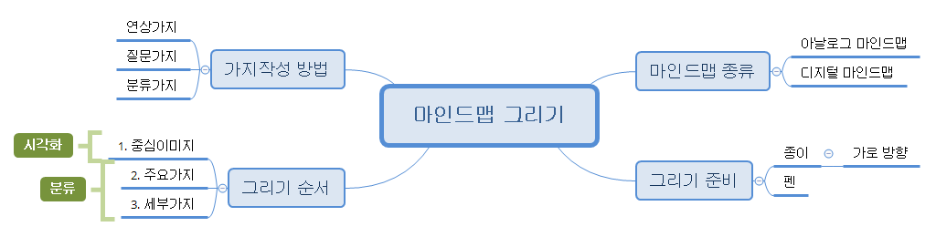 마인드맵을 그리는 순서는 '중심 이미지 -> 주요 가지 -> 세부 가지' 순이다. 마인드맵을 그릴 때 중요한 것은 ‘시각화와 분류’다. 우선 종이 중앙에 주제와 관련된 ‘중심 이미지’를 그린다. 사과에 관한 마인드맵이라면 사과 그림을 그리는 것이다. 굳이 이미지를 그리는 이유는 우리의 뇌가 글자보다 이미지를 더 잘 기억하기 때문이다. 주제에 대한 중심 이미지를 구상하면서 창의력을 담당하고 있는 우뇌도 같이 발달하게 된다. 둘째, 각 주요 가지를 정한다. 주요 가지는 마인드맵의 방향을 결정하는 중요한 요소다. 주요 가지에 대해서는 뒷부분에 하나의 장을 할애해서 그 중요성을 자세히 설명하도록 하겠다. 셋째, 주요 가지에 따라 세부 가지를 작성한다.