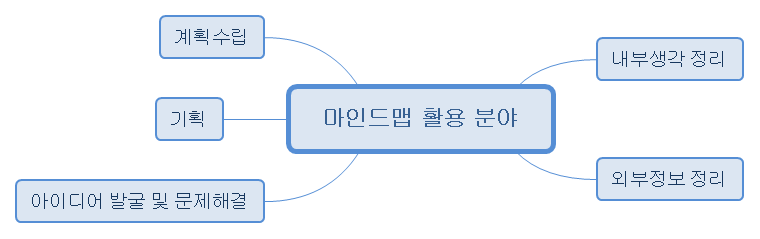 그럼 마인드맵은 어디에 활용할 수 있을까? 생각이나 정보를 정리하고 구조화하는 모든 분야에 마인드맵을 활용할 수 있다. 활용 목적에 따라서는 크게 다섯 가지로 나눌 수 있다. 첫째, 내부 생각 정리, 둘째, 외부정보 정리, 셋째, 아이디어 발굴 및 문제 해결, 넷째, 기획, 다섯째, 계획 수립. 이 다섯 가지 유형은 독립된 것이 아니라 유기적으로 연결돼 있다. 마인드맵을 작성할 때는 활용 목적을 분명히 해야 한다. 목적이 없는 마인드맵은 작성 도중 길을 잃게 된다. ‘내가 왜 중심 이미지를 그리고 있지? 이미지는 안 그리면 안 되나? 내가 왜 가지를 뻗고 있지? 가지는 몇 개나 그려야 되지?’... 목적 없이 그린 맵은 아무리 멋진 중심 이미지를 완성해도 허무하다. 사용할 곳이 없기 때문에. 그래서 마인드맵을 그리기 전에 얻고자 하는 것이 무엇인지를 분명하게 해야 한다. 각 활용 목적에 따른 마인드맵 작성방법과 사례들에 대해서는 다음 장부터 각 유형별로 자세히 설명하도록 하겠다.