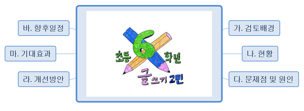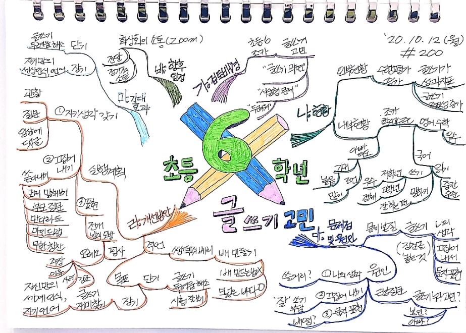 초등학교 6학년, 글쓰기, 두려움. 내가 생각한 키워드다. 숫자는 글자보다 눈에 더 잘 띈다. ‘6’이란 숫자를 가장 크게 그렸다. 글쓰기를 상징하는 것은 뭐니 뭐니 해도 연필. 글쓰기에 대한 두려움은 두 자루의 연필을 ‘X’로 표시했다. ‘초등’, ‘글쓰기 고민’ 등 나머지 글자는 작게 그렸다.