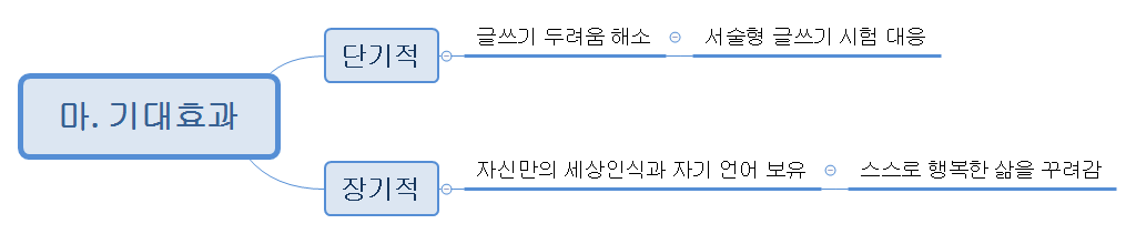 단기적으로는 글쓰기에 대한 부담이 사라져서 수행평가에 잘 대응할 수 있고, 장기적으로는 자신의 뚜렷한 세상 인식과 섬세한 자기 언어를 가져 스스로 행복할 줄 아는 사람이 될 수 있을 것이다.