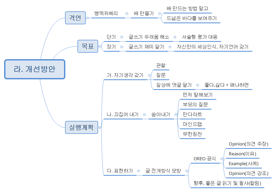 개선방안의 목표는 단기 목표와 장기 목표로 나눠볼 수 있다. 단기 목표는 글쓰기 두려움을 해소하고 서술형 글쓰기 수행평가 점수를 잘 받는 것이다. 그러기 위해 ‘잘 쓰자’에서 ‘잘’이란 말을 떼어내도록 아빠의 칭찬과 기다림이 필요해 보인다. 조카도 생각의 돌멩이들을 쏟아내는 연습이 필요하다. 글로 쓰기 전에 먼저 말해보기, 만다라트와 마인드맵 같은 도구도 생각 쏟아내기에 도움이 된다. 잘 배열하는 연습도 필요하다. 생각의 돌멩이들을 꺼낼 수만 있다면 배열하는 것은 쉽다. 몇 가지 배열 유형만 익히면 된다. 장기 목표는 말과 글을 통해 자신을 표현하는 것에 대한 기쁨을 깨닫고 자신만의 세상 인식과 자기 언어를 갖고 자주적인 삶을 살아가는 것이다.