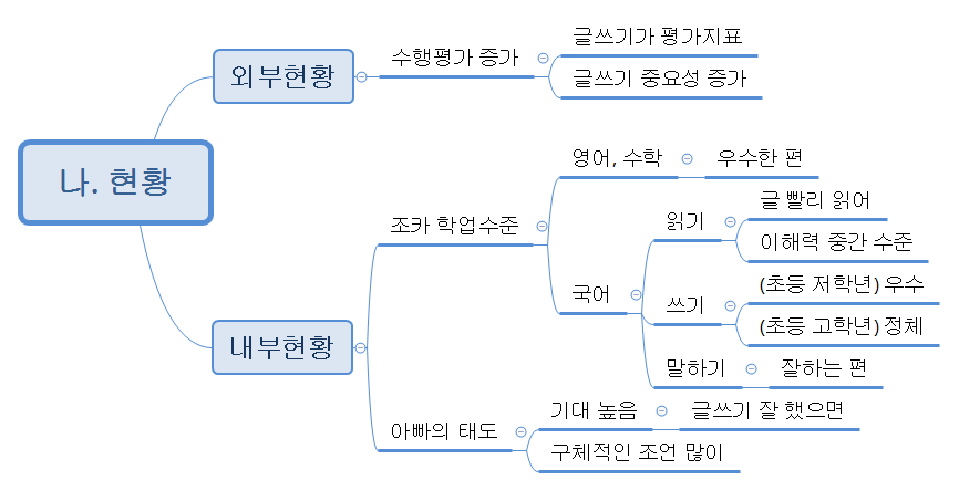 문제 관련 현황은 ‘외부 현황’과 ‘내부 현황’으로 나눌 수 있다. 외부 현황은 ‘수행평가 증가’를 들 수 있다. 수행평가의 평가지표는 글이다. 고로 ‘수행평가 증가 = 글쓰기 중요성 증가’를 의미한다. 내부 상황을 살펴봤다. 조카의 영어, 수학 성적은 우수한 편이었다. 어릴 적부터 영어, 수학 학원을 다녔다. 또한, 영어, 수학은 공부방법이 쉽다. 외우면 된다. 국어는 어떨까? 읽기 능력은 중간 수준이었다. 초등학교 저학년 때는 동시 등 제법 글을 썼는데 고학년이 될수록 글쓰기가 정체됐다고 한다. 논술학원 선생님 말로는 발표는 제법 잘한다고 했다. 조카의 글쓰기에 대한 아빠(우리 형)의 태도는 어떨까? 아들이 깊이 있게 사고하고 글을 잘 쓰기를 바라며 글쓰기에 대한 구체적인 조언을 많이 한다고 했다.