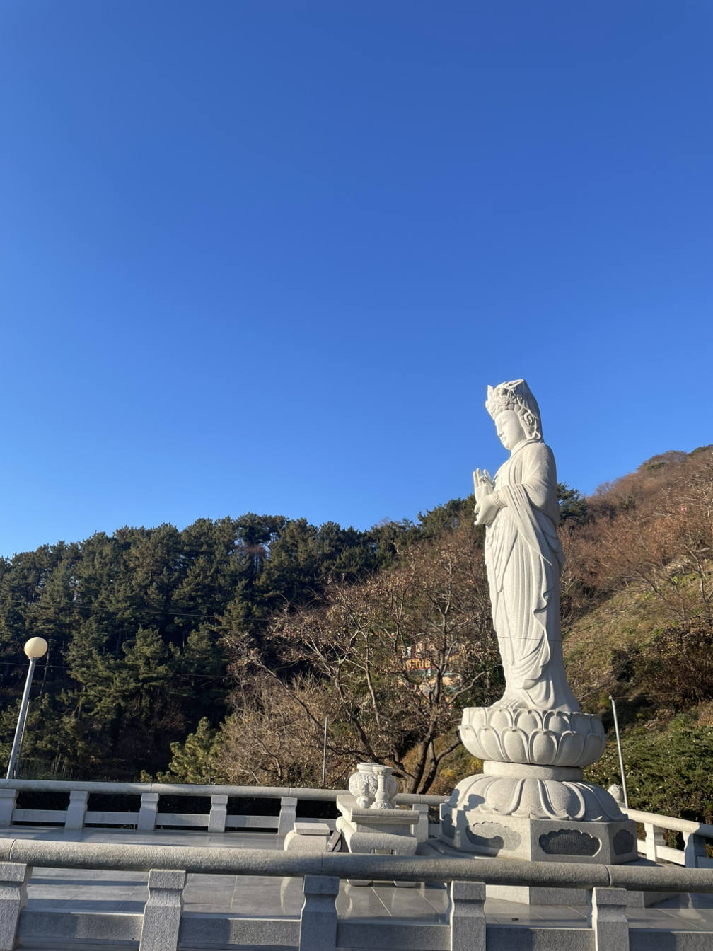 먼저 해수관음상을 보고 싶었다. 바다가 펼쳐진 절경 끝에 보이는 관세음보살상이라고 했다. 팻말을 따라 천천히 걸었고, 귀를 곤두세우며 총성과 작은 동물들이 풀숲을 오가는 소리에 귀 기울였다. 그리고 언덕을 넘자, 마법 같은 풍경이 펼쳐졌다. 마을에서 올라오며 느꼈던 한기가 한 번에 녹는 그 풍경이.