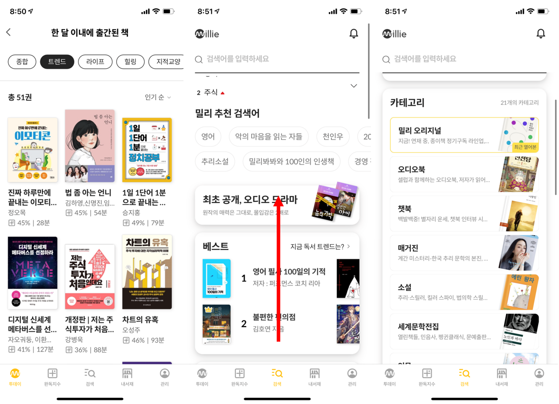현재 내가 기획하고자 하는 서비스는 검색이 안 되었을 때 표시되어야 함으로, 하단 내비게이션을 중심으로 살펴보려고 한다. 이때 놀라운 점을 발견했는데, 밀리의 서재에서 '카테고리를 빠르게 찾을 수 없다' 라는 VOC를 확인했는지, 검색 창을 눌렀을 때 바로 하단에 카테고리를 표시했다!