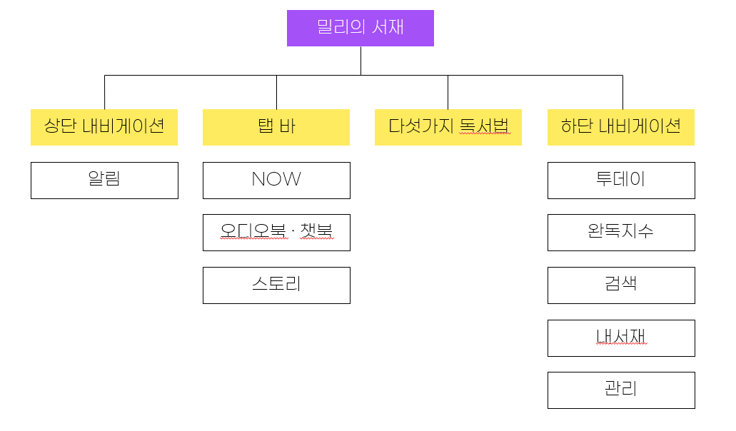 다음은 만일 실제로 해당 서비스가 도입된다면, 고객들은 어디에서 찾을 수 있을 지를 살펴보고자 밀리의 서재 정보 계층 구조도를 작성해보았다. 현재 기획하고 있는 서비스가 어디에 위치될 지를 고민하며, 해당 내용을 중심으로 작성해보고자 한다.