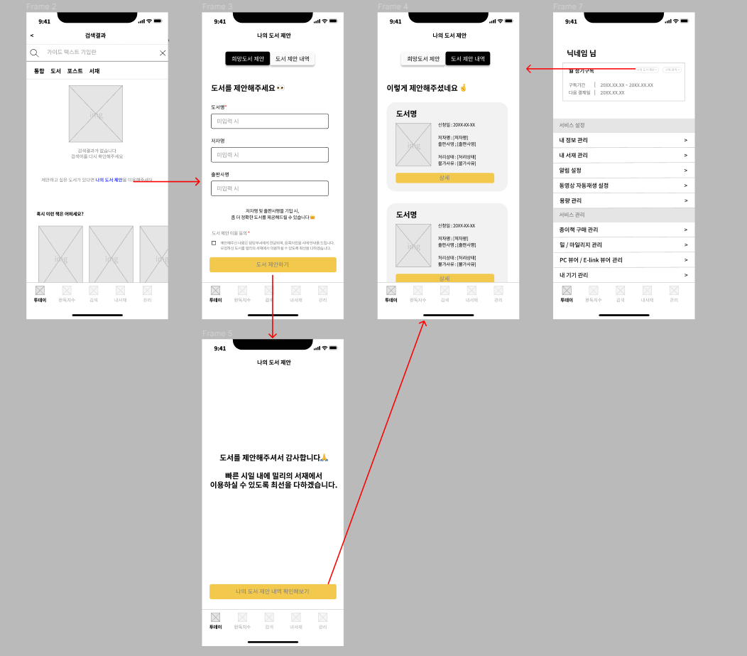 Lo-fi 프로토타입의 경우, 핵심적인 페이지만을 작성했다. 그리고 이를 피그마 툴로 제작해보던 중, [도서 제안하기] 버튼을 눌렀을 때, 제안이 정상적으로 처리되었음을 알려주는 페이지 역시 있으면 좋지 않을까? 하는 생각이 들어 아래의 Frame 5 페이지 역시 작성하였다.