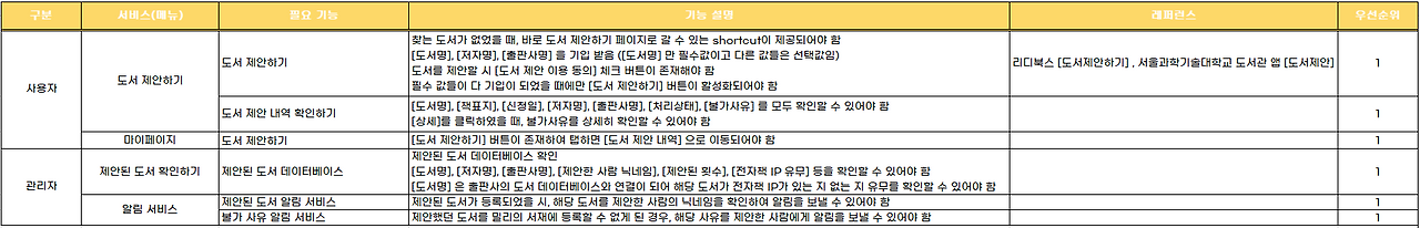 우선순위는 모두 최우선으로 설정을 하였는데, 왜냐하면 [도서 제안하기] 서비스 자체에 위의 모든 기능들이 충족이 되어야 정상적으로 작동할 수 있다고 말할 수 있기 때문이다. 그럼에도 가장 중요한 기능이 무엇이냐고 물어본다면 [관리자] - [제안된 도서 확인하기] 기능이라 할 수 있다.
