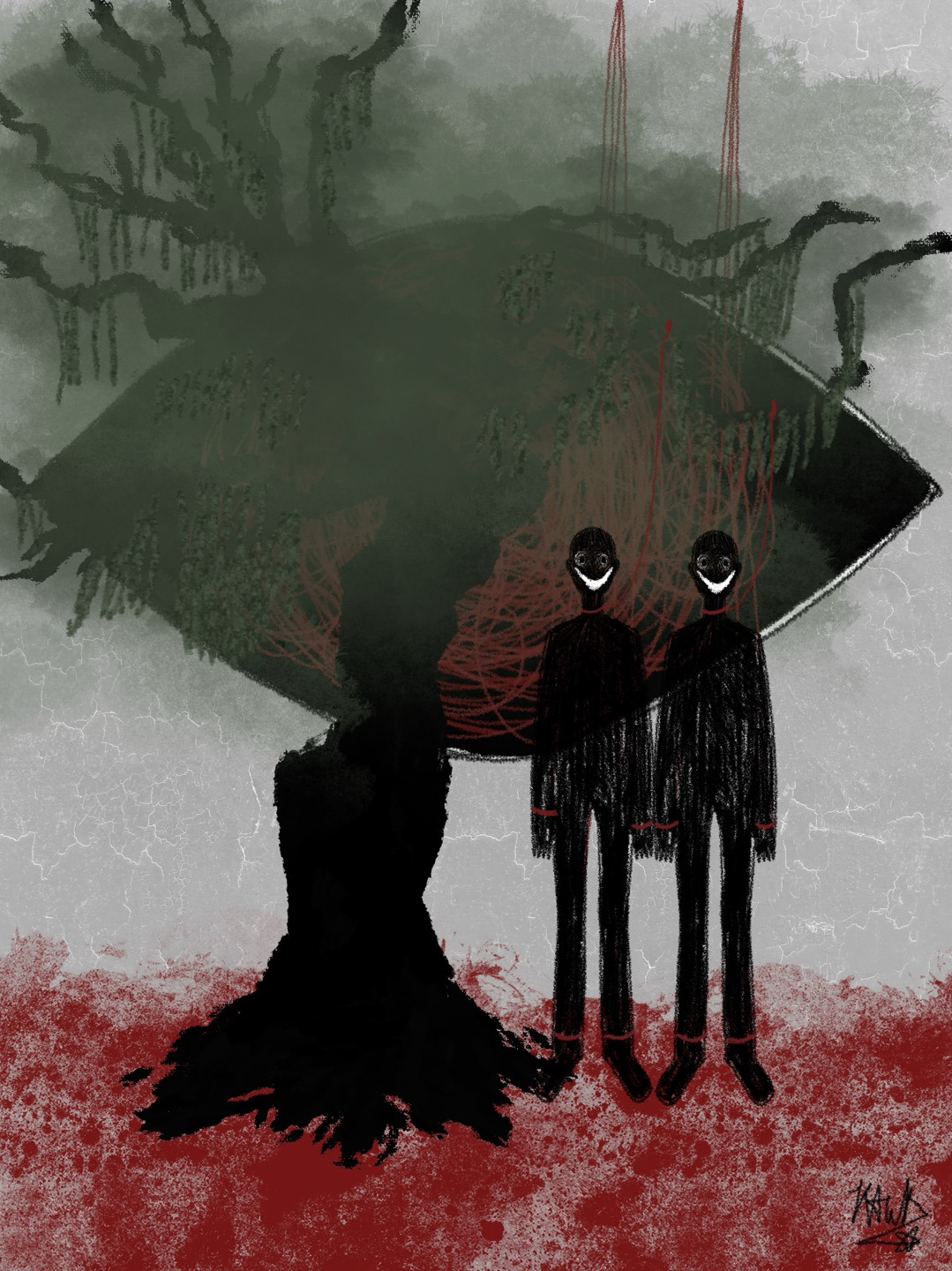 억지로 들어오게 된 그림 속 세상은 의외로 평화로워 보였다. 검은 배경 위에 초록 잔디가 작은 원을 이루고 있었고, 그 중앙에는 거대한 나무 한 그루가 자리한 간단한 공간이었다. 그러나 이 고요함 속, 배경과 하나 된 듯 검은 아우라를 띠는 '어떤 것'. 두 존재가 눈에 들어왔다. 나를 잠식할 것 같은 그 형체들이 나무 옆에 도사리고 있었기에, 유일한 색채인 그곳에 가까이 갈 수 없었다.