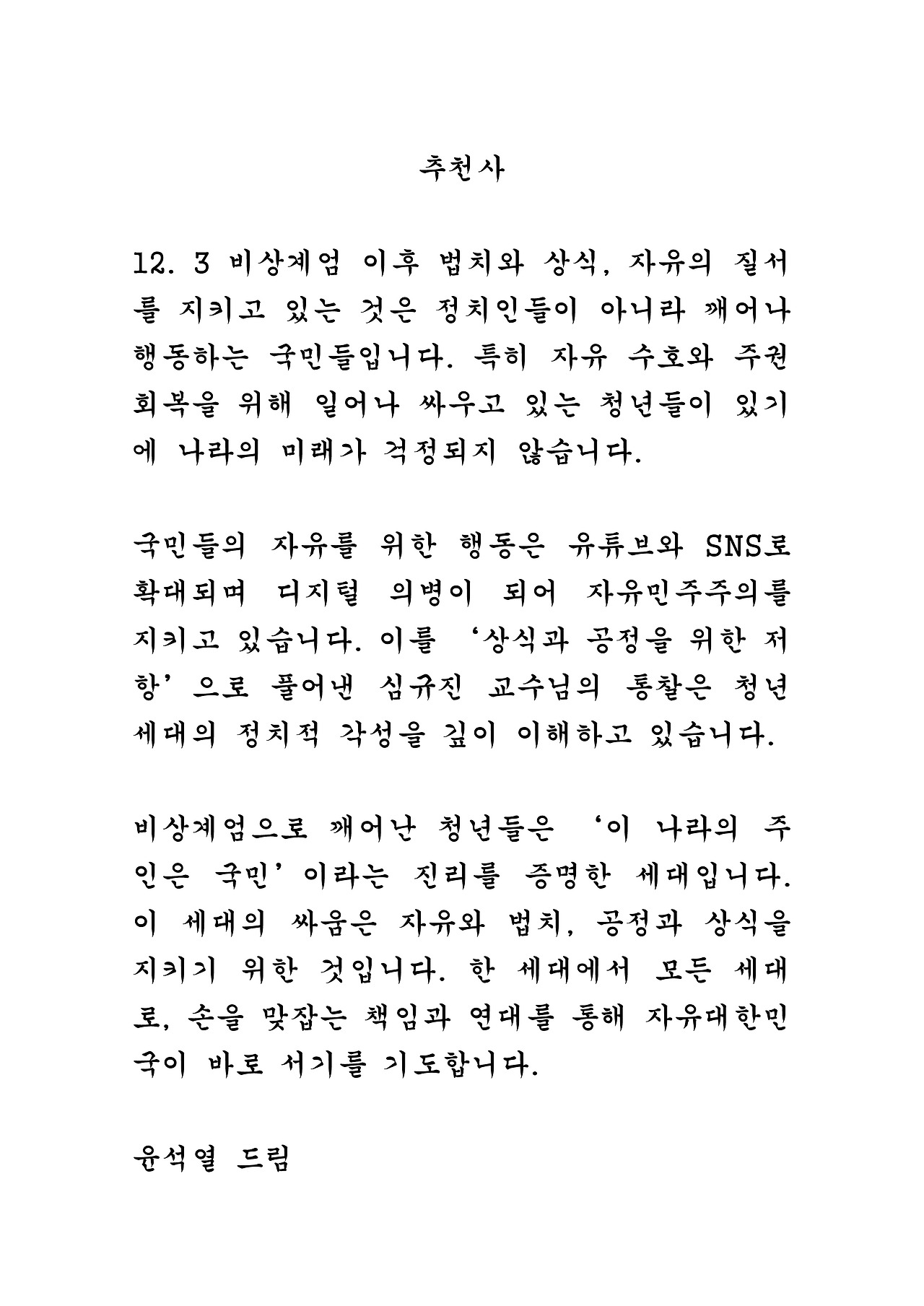 “심규진 교수의 통찰은 청년 세대의 정치적 각성을 깊이 이해하고 있다” (윤석열 대통령)