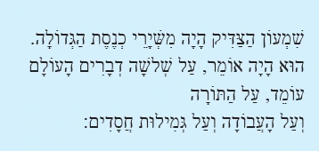 세상을 지탱하는 세 가지 덕목을 가르치고 있다. 첫째는 토라요, 둘째는 예배(아보다)이고, 셋째는 선행(헤세드)라는 것이다. 토라는 좁은 의미로는 모세오경을, 넓은 의미로는 구약성경 전체를 일컫는다. 유대교는 경전의 종교인지라 토라가 없는 세상은 상상도 할 수 없었을 것이다. 경전이 없다면 신의 뜻을 알 수도 없고 신에게 예배할 수도 없을 것이다.