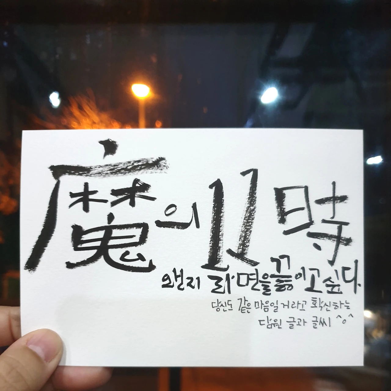 魔의 11時왠지 라면을 끓이고 싶다.당신도 같은 마음일거라고 확신하는담원 글과 글씨 어째서 11시인걸까?사진 속 엽서 뒤 불빛이라면을 끓이라 속닥대는마귀씨의 눈빛같다.