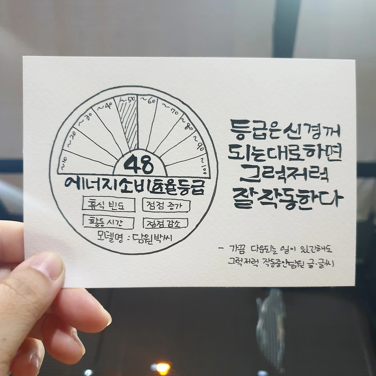 여튼 그렇게 나이를 먹다보니 예전같지 않다던 어른들 말씀을 내가 하고 있다. 오늘은 엽서에 뭘 쓸까 고민하며 냉장고를 기웃거리다가(응?) 붙어있는 에너지효율등급 스티커에 눈이 갔다.