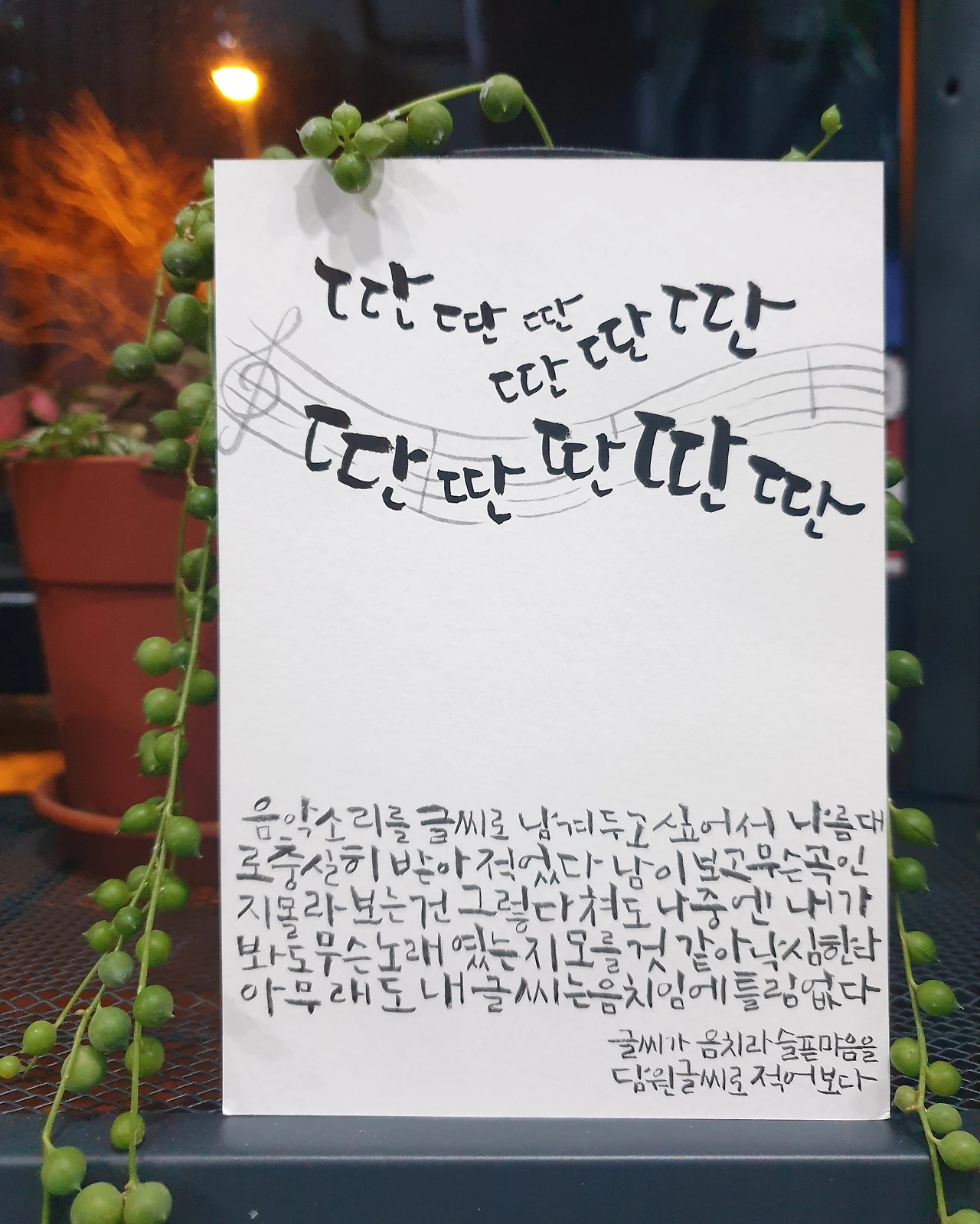 음악소리를 글씨로 남겨두고 싶어서나름대로 충실히 받아 적었다.남이 보고 무슨 곡인지 모르는 건 그렇다 쳐도나중엔 내가 봐도 무슨 노래였는지 모를 것 같아낙심한다.아무래도 내 글씨는 음치임에 틀림없다.<담원글>