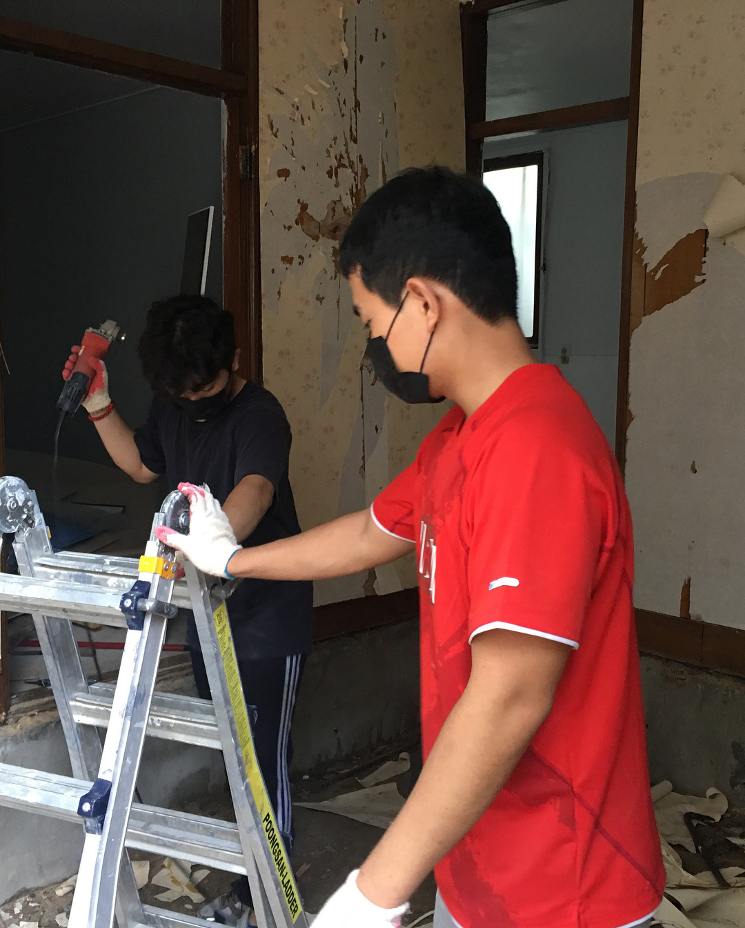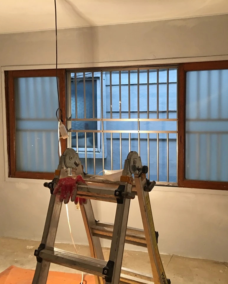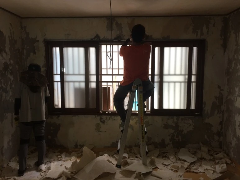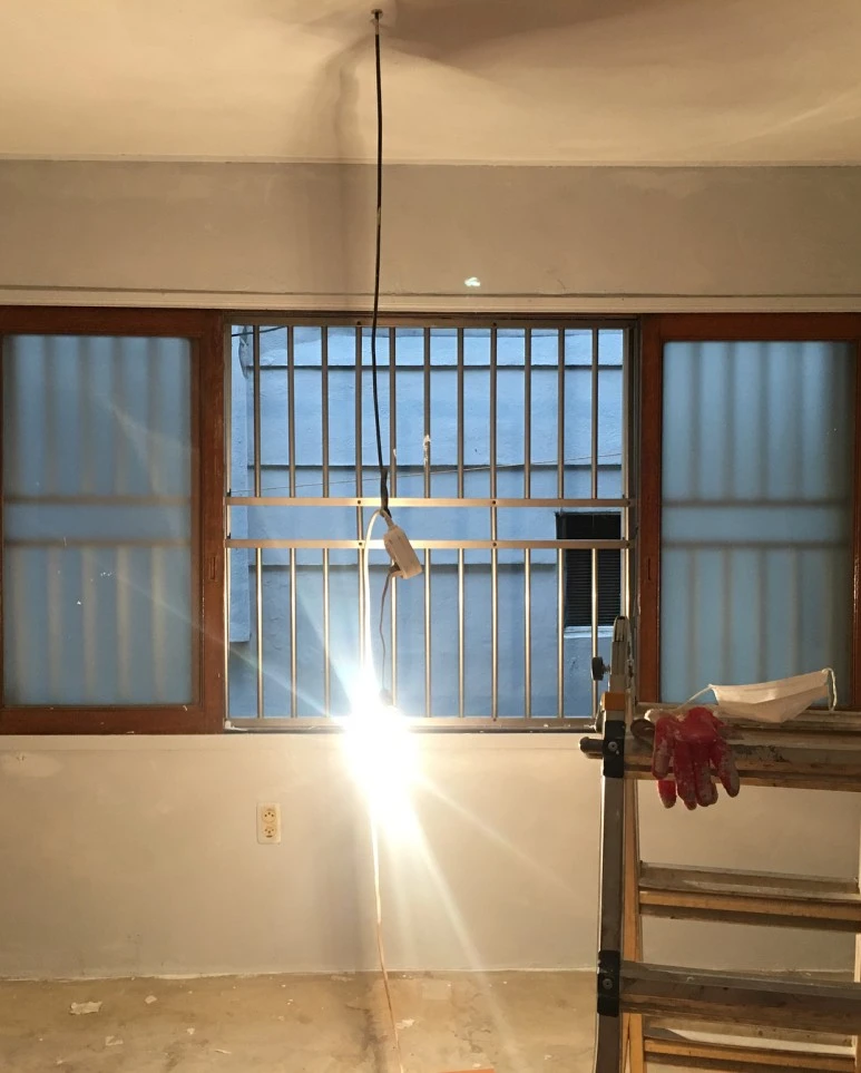 : 원래 가정집이어서, 벽면에도 나무판자가 붙어있었고 우리가 원하는 공간 인테리어랑 맞지 않는 모양이었어요. 우리는 노출 콘크리트 컨셉으로 공간을 계획 중이어서 다 뜯어냅니다.