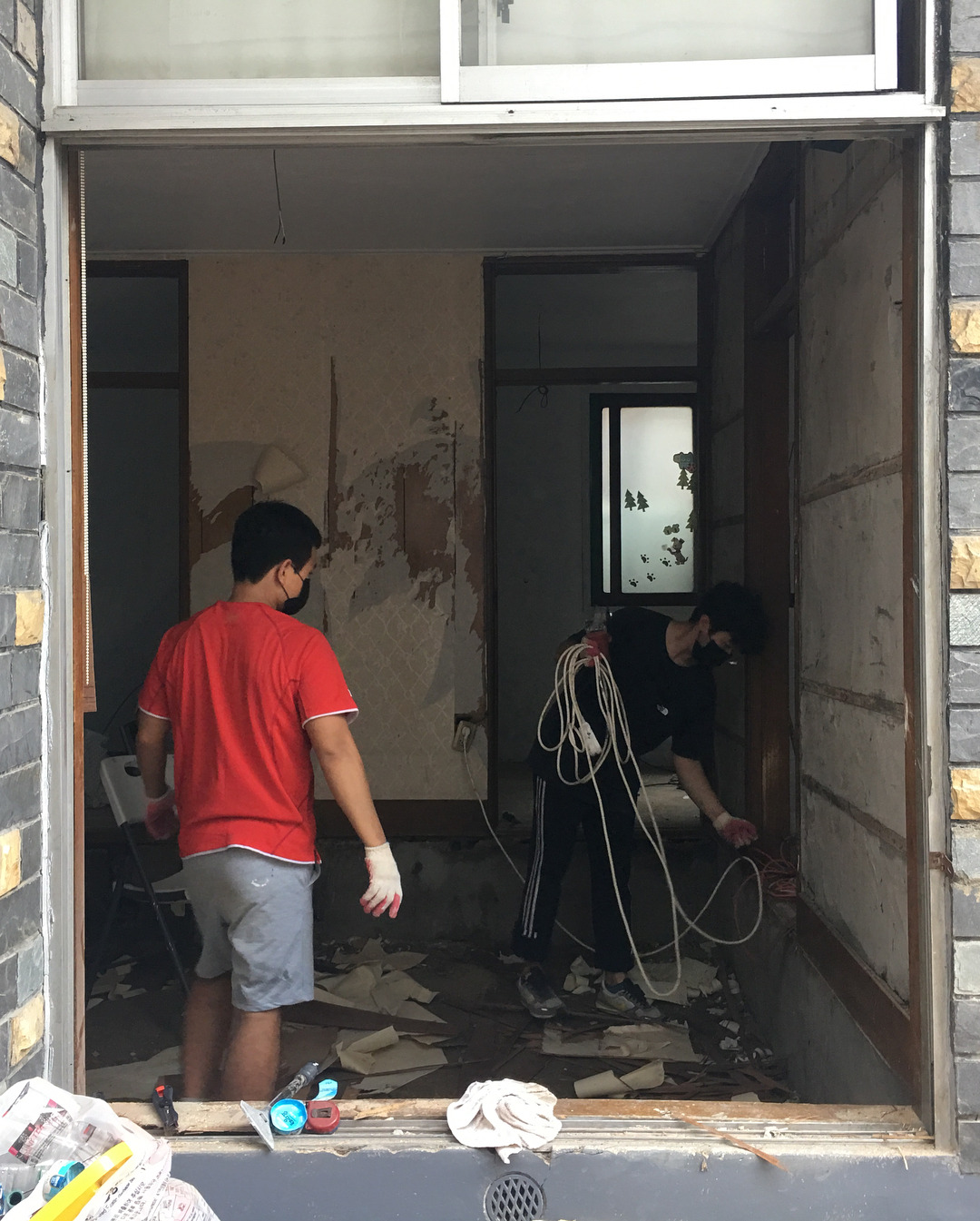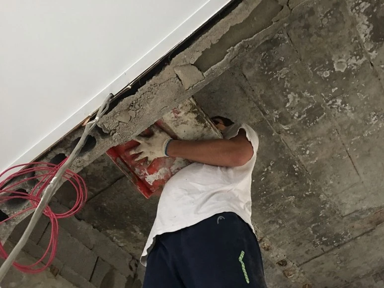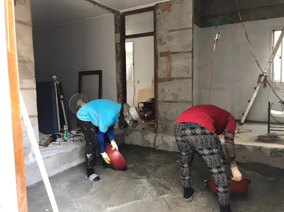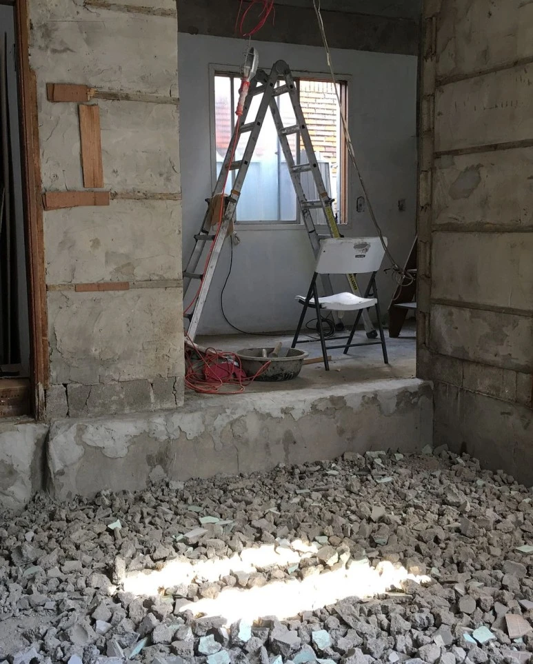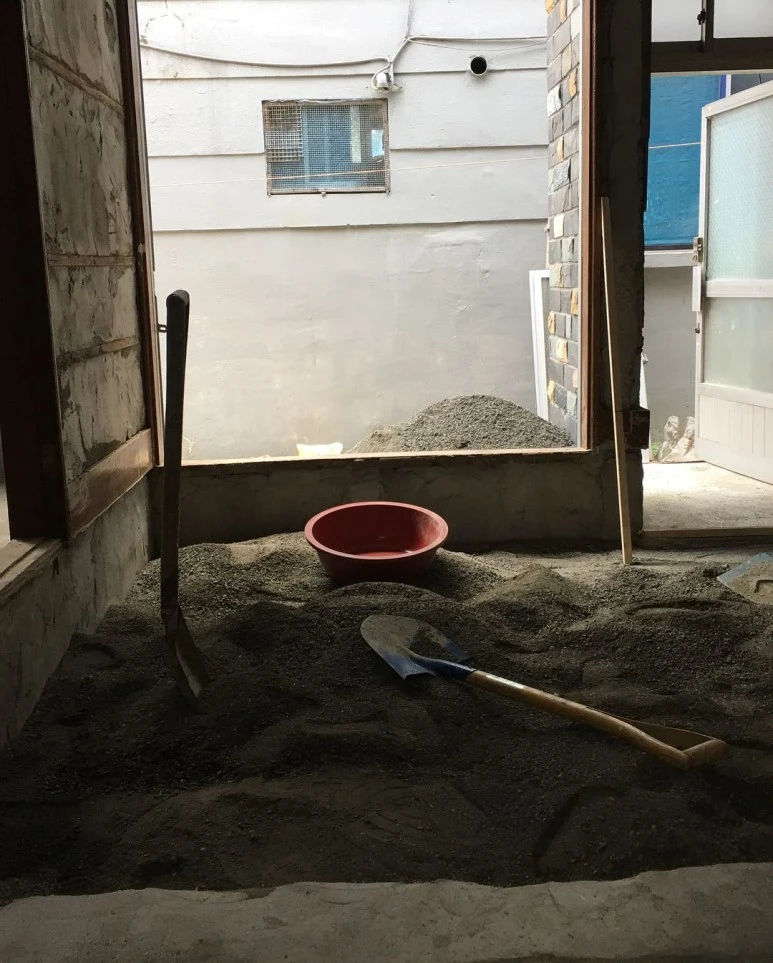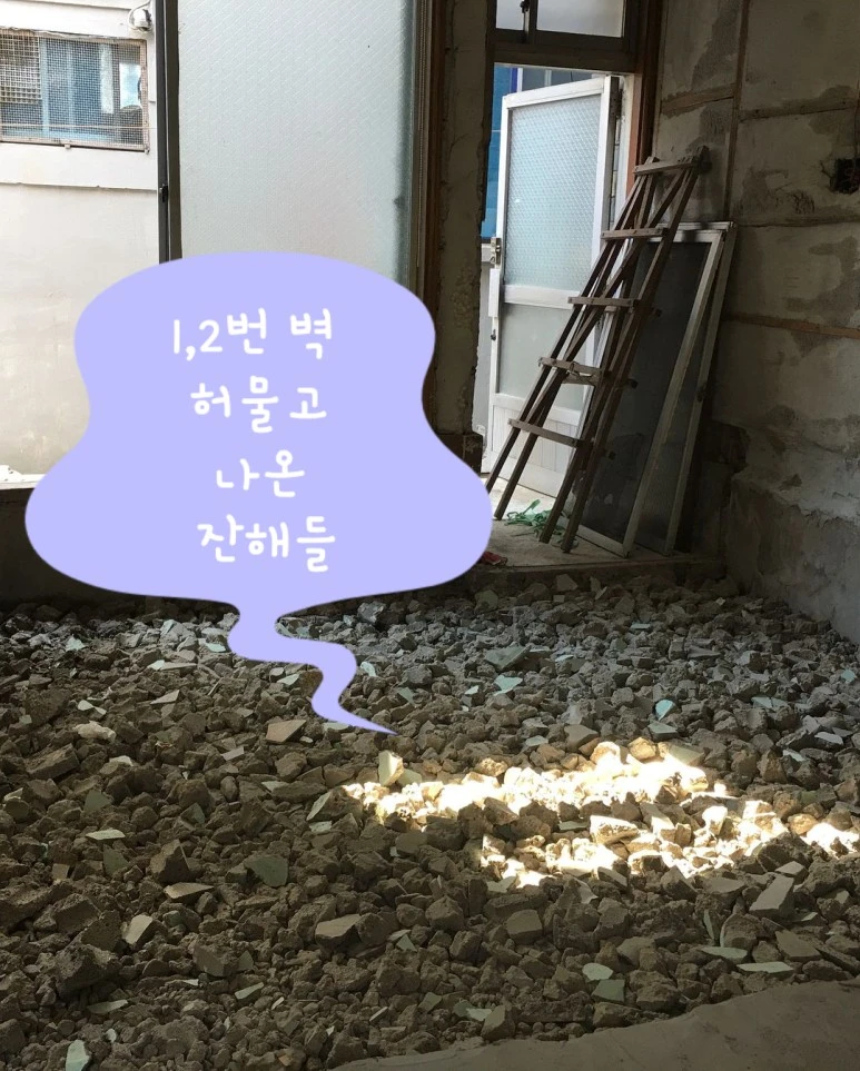 : 벽을 허무는 일은 저희가 임의로 할 수 없어서, 전문가분을 돈 주고 불렀어요. 하중을 받고 있는 벽을 허물면 큰일 나니까요! 벽을 허물고 나온 시멘트 덩어리들은 어느 정도 잘게 부숴서 바닥에 깔아줍니다. 바닥 시다지(시멘트랑 모레 섞어서 붓는 작업) 할 때 소모되는 시멘트의 양을 줄일 수 있어요.