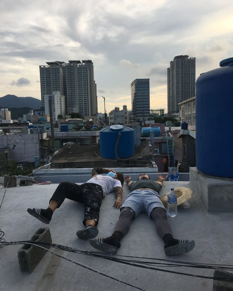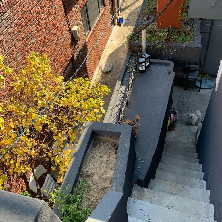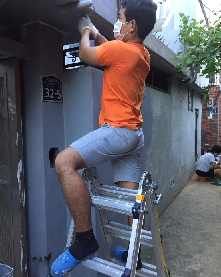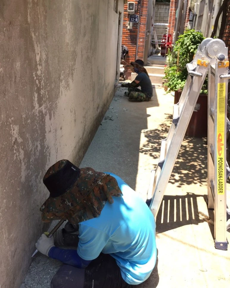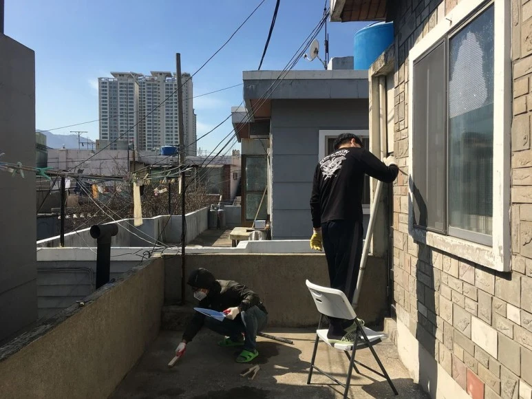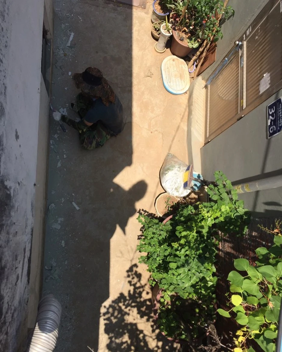 : 2층은 공동대표 중 한 명이 사는 공간인데, 2층 천장 역시도 누수가 있었어요. 건물 측면 페인트 작업하는 김에, 지붕까지 방수 작업합니다. 방수하기 전에, 바닥 긁어내는 것도 많이 힘들어요..
