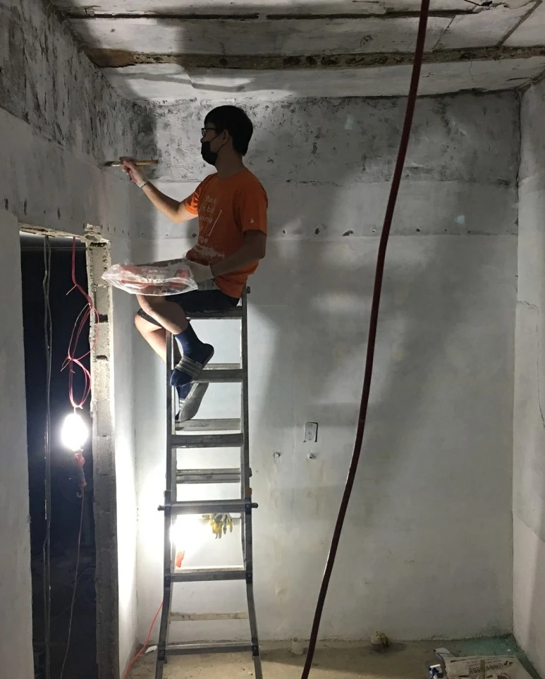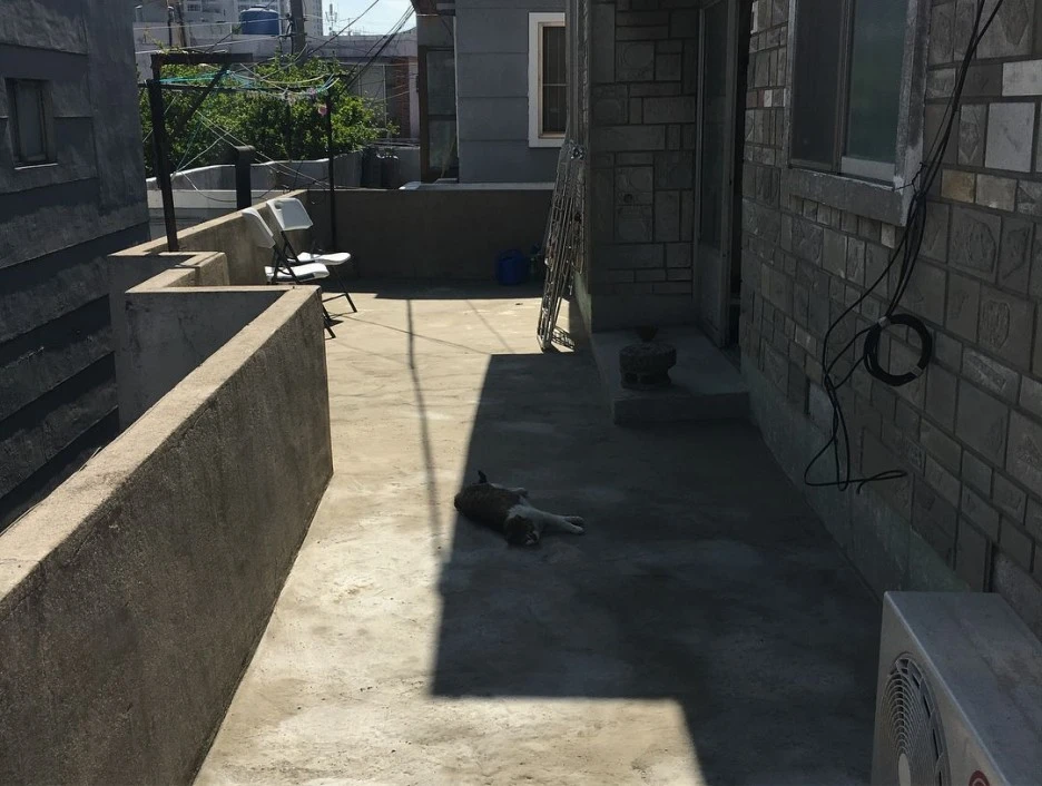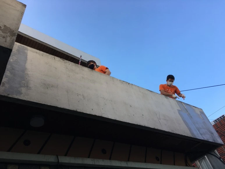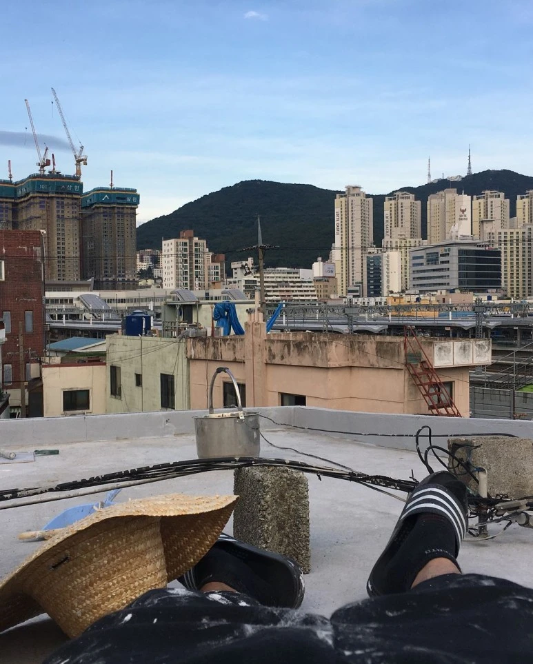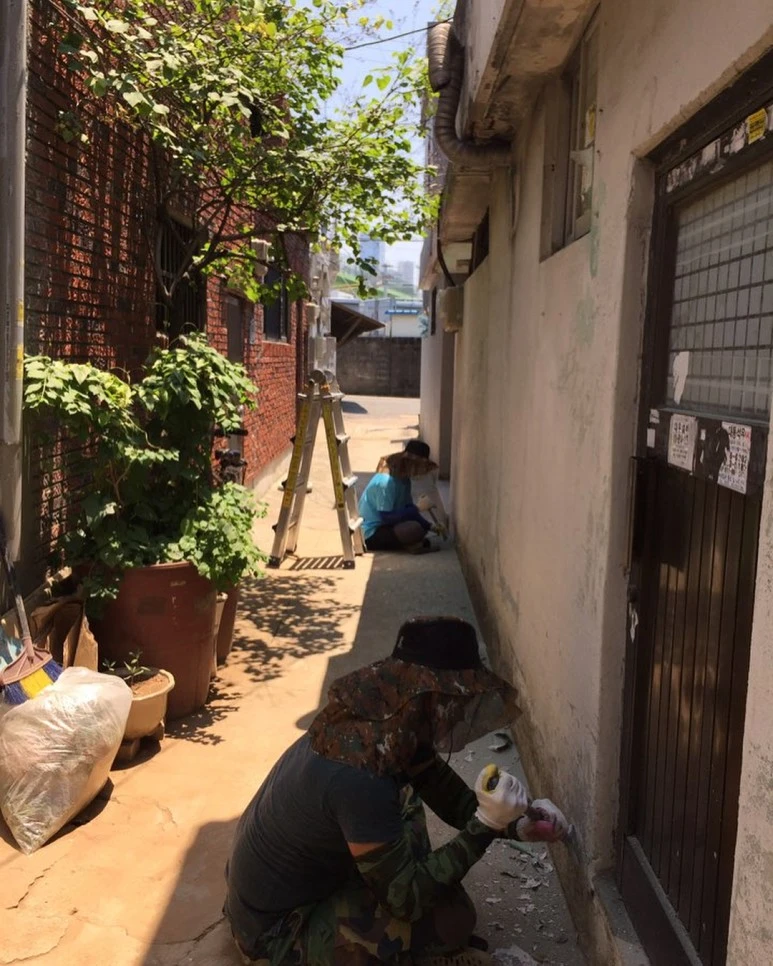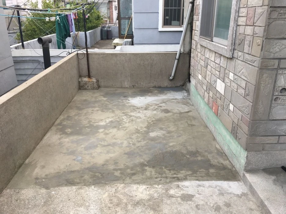 : 2층은 공동대표 중 한 명이 사는 공간인데, 2층 천장 역시도 누수가 있었어요. 건물 측면 페인트 작업하는 김에, 지붕까지 방수 작업합니다. 방수하기 전에, 바닥 긁어내는 것도 많이 힘들어요..