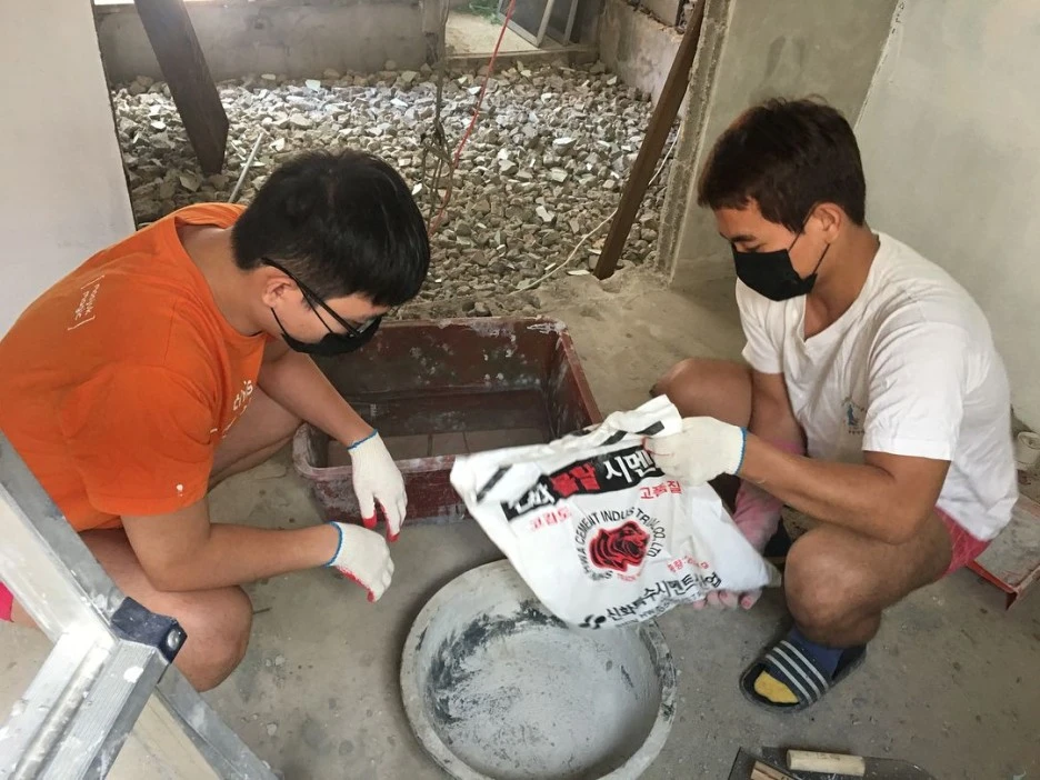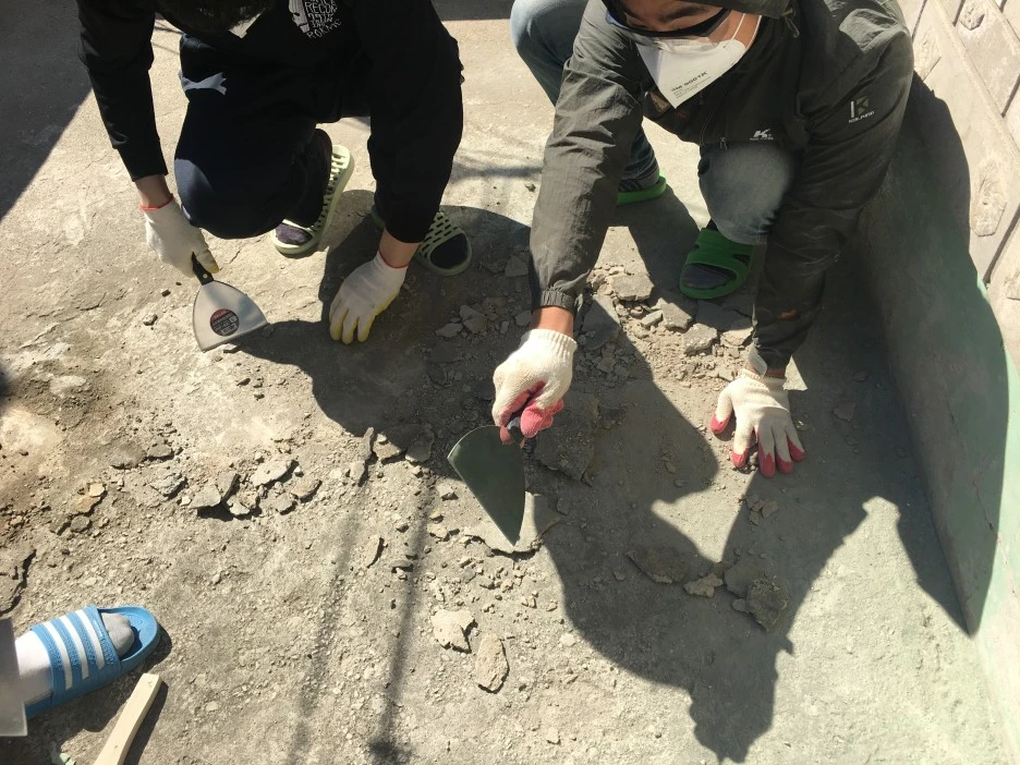 : 평평한 시멘트 바닥을 만들기 위해, 그 위에다 시멘트와 모레를 붓고 섞어줍니다.