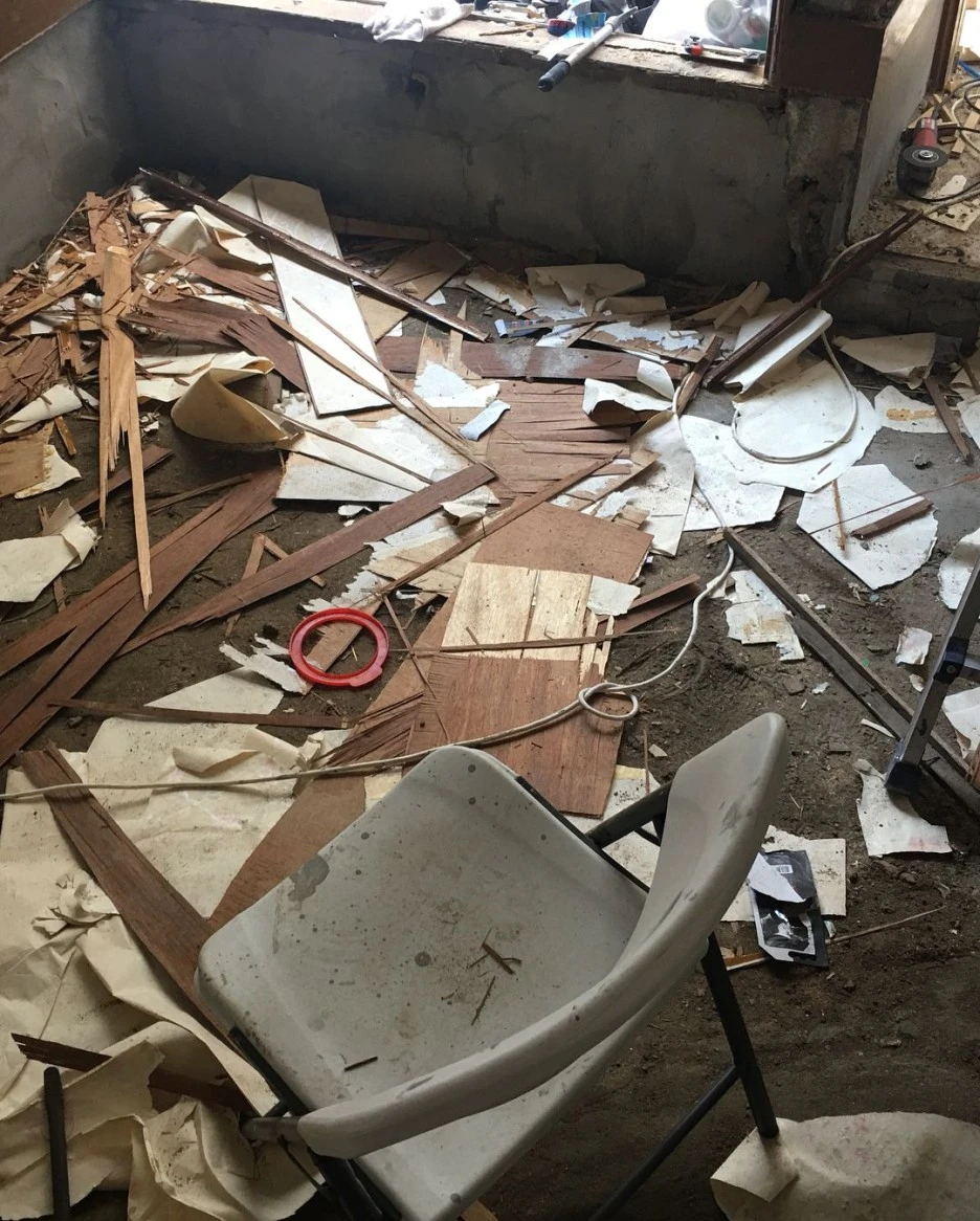 : 층고를 높이기 위해서, 그리고 노후화된 마룻바닥으로 찌그덩 소리가 났기 때문에 바닥을 조각조각 잘라 뜯어냈어요. 목수 친구가 있어서, 친구에게 우리 멋진 공간을 만들고 있다고 오랜만에 연락을 해서 도움을 구했습니다!