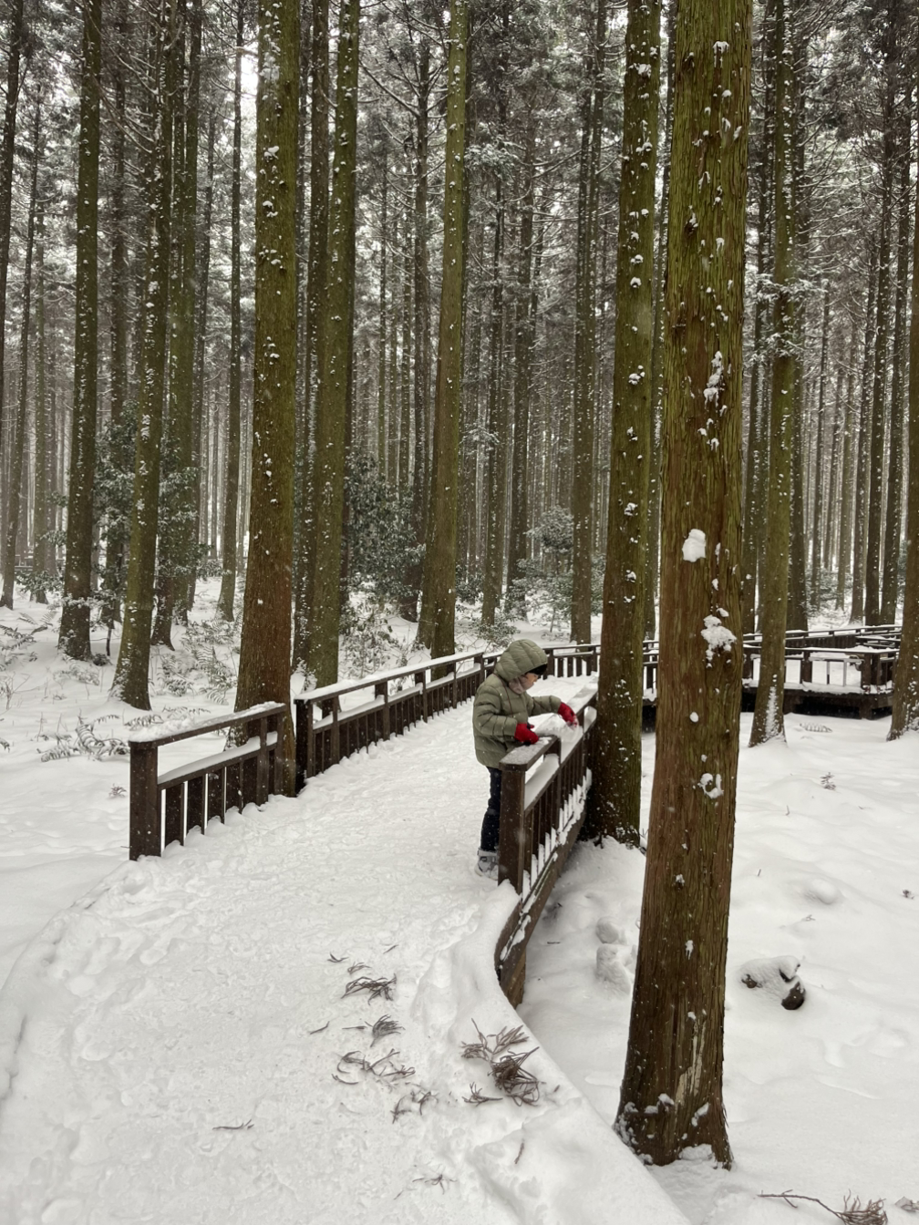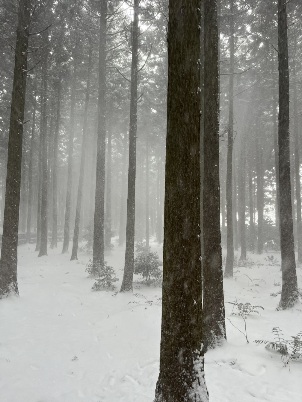 눈 덮인 삼나무들이 빼곡한 숲 안은
