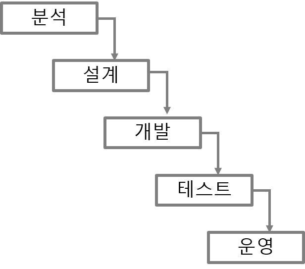 프로젝트의 각 단계에서 한 단계가 완료되면 다음 단계로 실행하는 선형적이고 순차적인 방법론이다. 쉽게 말해 폭포 물이 내려와 위의 항아리를 채우고 넘쳐서 다음 아래 항아리를 채우는 것처럼, 앞 단계가 끝나고 나면 다음 단계로 넘어간다는 방법론이다.(이것이 뭔 방법론이여~ 당연한 거지~라는 생각이 들 것이다.)