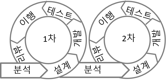 요구사항 분석 => 설계 => 개발 => 테스트 => 이행 및 운