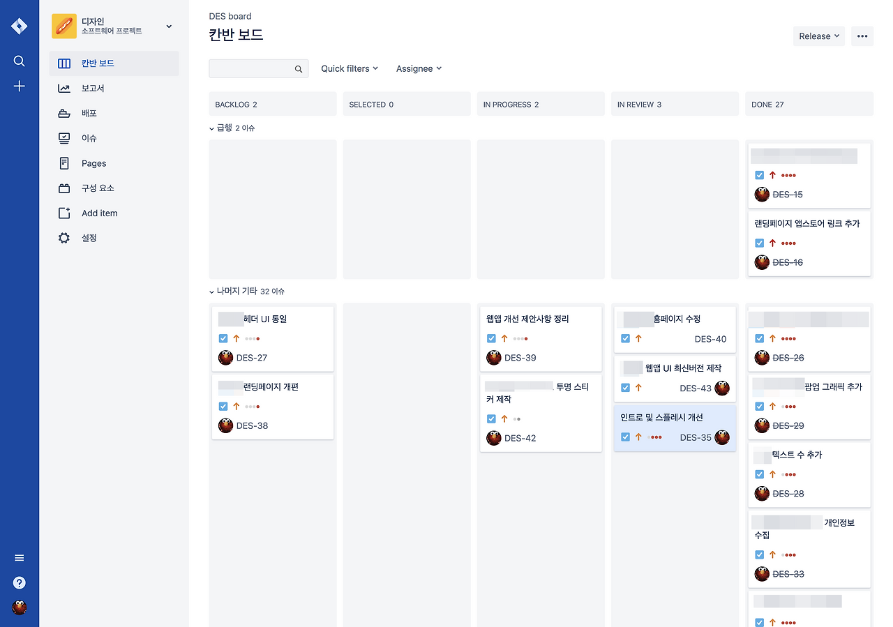 사실 지라는 개발자들에게 더 효과적인 툴이라 디자이너에게 어떤 식으로 적용해야될지 잘 몰랐다. 당시에 개발은 팀이 있었지만 디자인 팀은 나 혼자였으니 보고자도, 관리자도 담당자도 모두 나였다ㅋㅋㅋㅋ 그래도 디자이너가 하는 일을 가시화하는 것도 중요한 부분이라 생각해서 내가 하는 모든 디자인 업무를 아주 사소한 것까지도 테스크로 만들었고 칸반 보드에 나홀로 외롭게 기록하곤 했다.