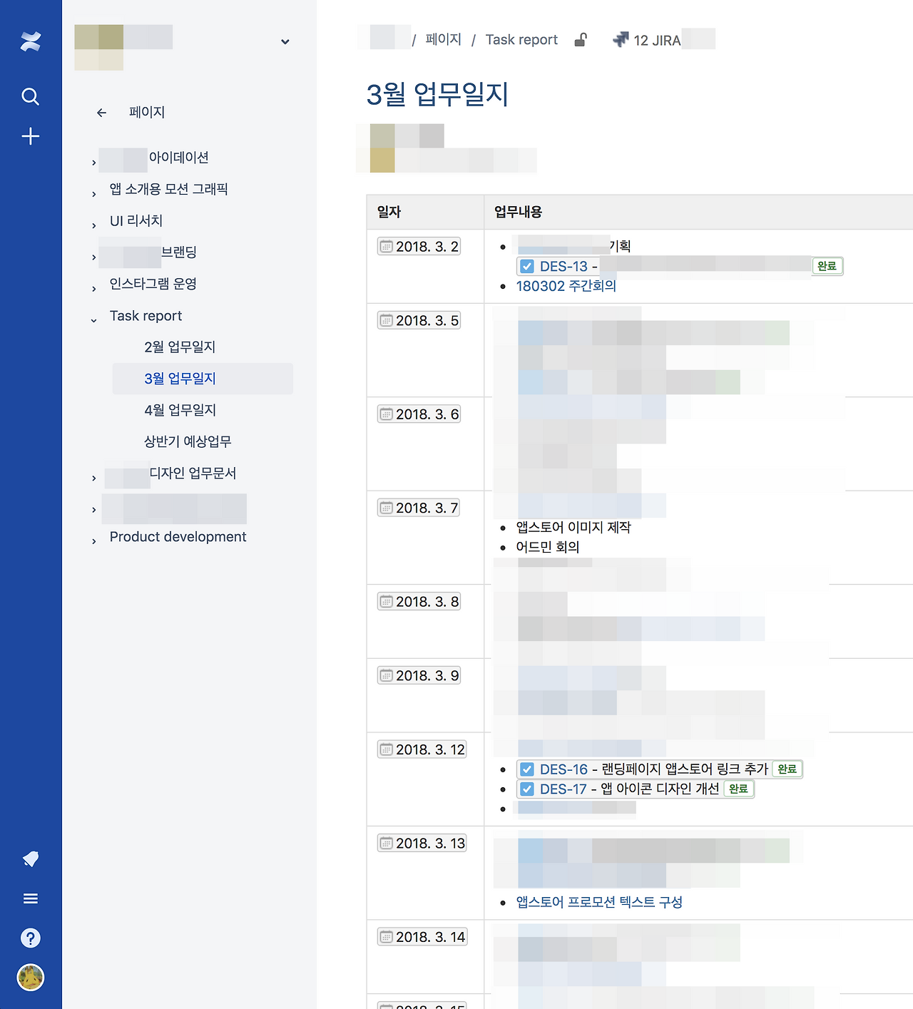 정리충의 또다른 면모는 바로 업무일지. 혼자 데일리 스크럼을 했다. 언제 무슨 회의를 했고 어떤 업무 했는지 지라 이슈 다 걸어놓고, 해당 문서도 걸어놓고ㅋㅋㅋㅋ 워낙 회의가 많다보니 이 사항이 언제 왜 결정됐는지 추적하기 어려울 때가 있어 고안한 방법이다.