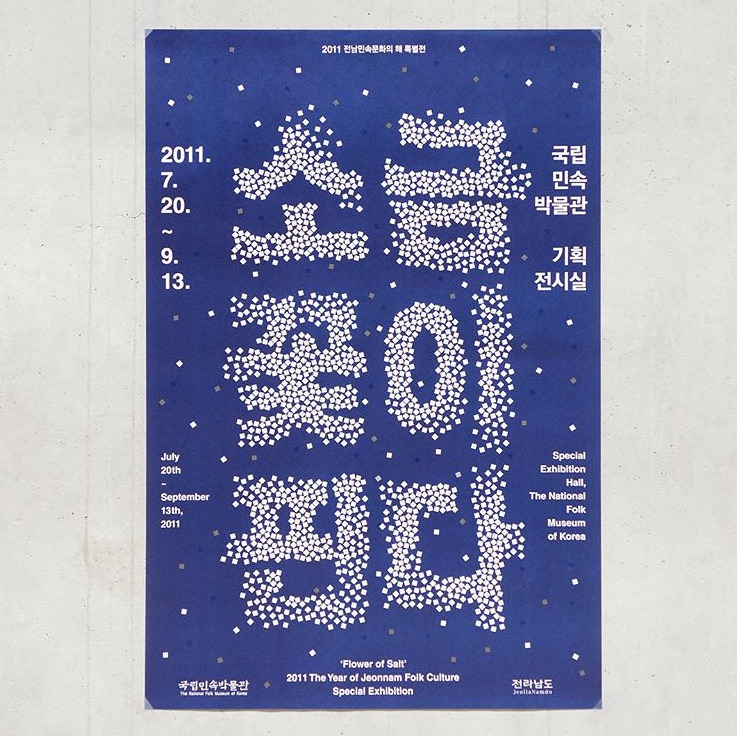 보통은 형태 자체를 이름답게 빚어내지만 컨셉에 맞게 파편화하고 조각내는 것도 효과적이다. 소금 꽃이 핀다는 6년 전에 실제로 본 작업이고 너무 좋아서 아직도 내 책상 벽에 붙어있다. 소금의 컬러와 형태(흰색 사각형)을 꽃처럼 흩날리게 무작위적으로 패턴화한 것이 정말 직관적이어서 충격먹었다. 6년이 지난 지금 봐도 전혀 촌스럽지 않은 작업. 이재민님을 존경하는 이유 중 하나다. 빠르게 변하는 디자인 트렌드 사이에서 이런 직관성과 변하지 않는 시간성... 으아!