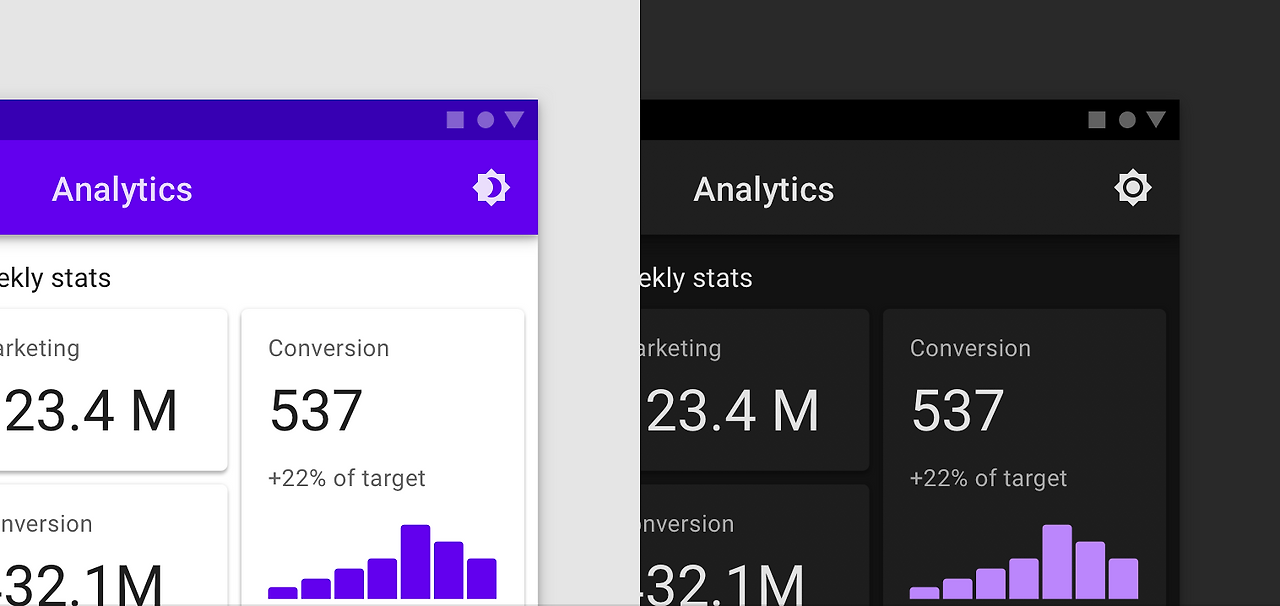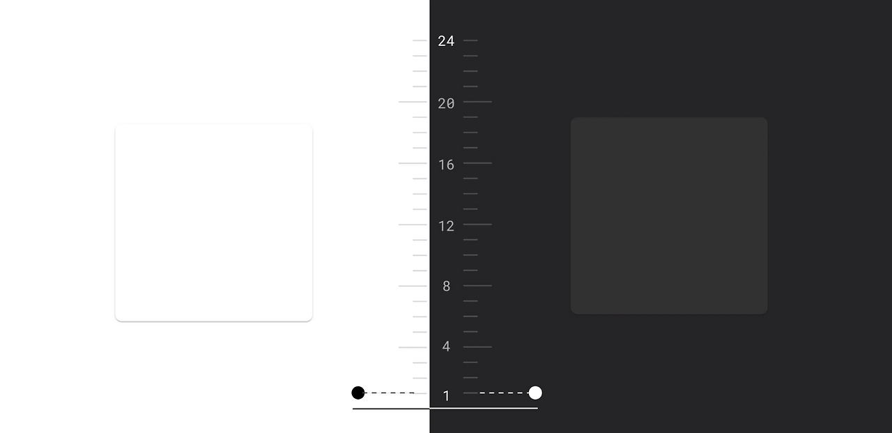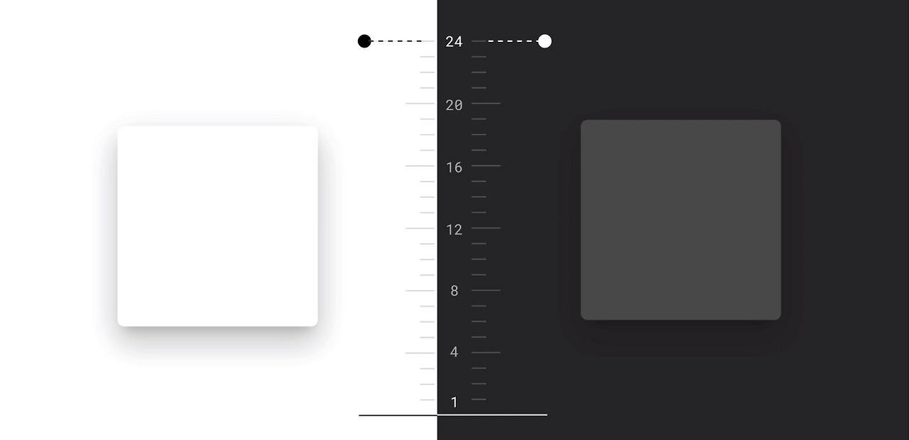 다크 테마는 UI 디자이너들에게 새로운 도전일 것이다. 흰 배경 위에서의 UI와 검은 배경에서의 UI는 생각보다 많은 것이 다르기 때문이다. 예를 들어 흰 배경 위에 개체를 표현할 땐 그림자를 짙게 깔면 되지만 검은 배경 위에선 그림자가 두드러지지 않기 때문에 더 높은 레이어일수록 표면을 밝게 빼야한다. 순수한 검은색이 아니라 어두운 회색을 사용하는 이유도 그림자를 표현할 수 있는 여지를 남기고, 너무 강렬한 흑백 대비를 피하기 위함이다.