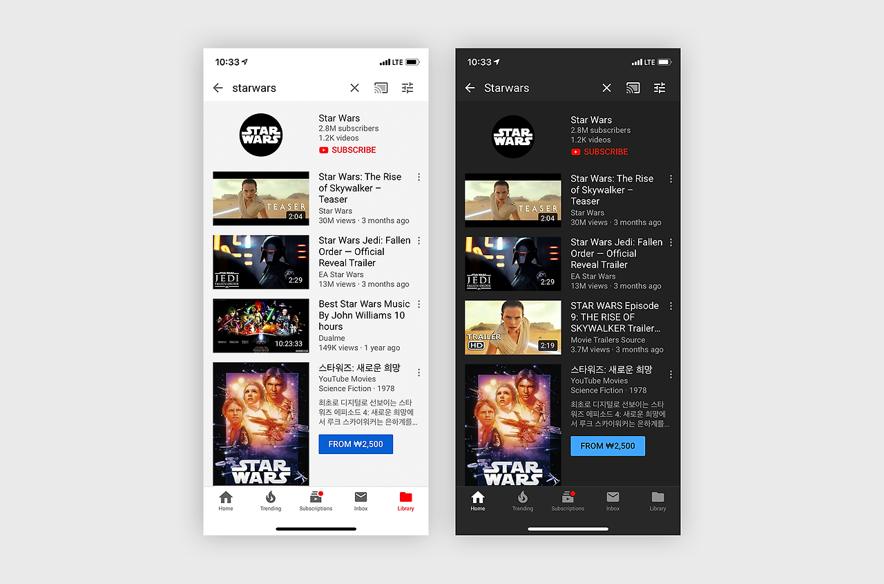 흰 배경에 비해 검은 배경이 더 어두워 보이기 때문에 같은 색이어도 더 명도를 높여야한다. 언뜻 보기에 같은 컬러처럼 보여도 실제론 선연하게 다른 값을 사용하고 있다. 배경 컬러로 끝날 게 아니라 거의 처음부터 컬러 팔레트를 다시 잡아야 한다.