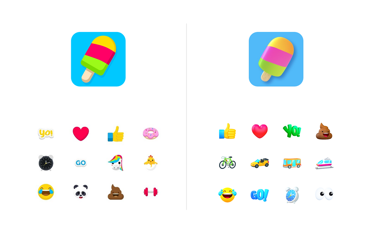 확실히 2D보다 주목도가 높다. 앱 아이콘을 자세히 보면 막대의 나무 질감까지 표현되어있지만 아이스크림 부분은 실제와 다르게 먹을 수 있을 것 같은 질감은 아니다. 이질감과 실제감이 묘하게 공존하는 그래픽이다. 스티커들은 글자나 기호들이 많아 현실 세계의 메타포를 그대로 베꼈다고 보기 어렵다. 새로운 스큐어모피즘은 3차원으로 비현실적인 요소를 구현하며 일종의 판타지를 만들어낸다는 특징이 있다.