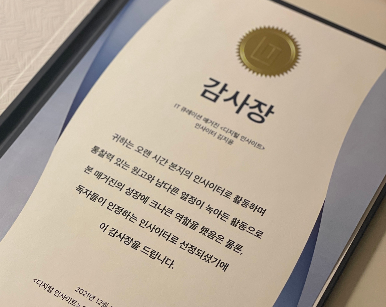 디지털 인사이트에서 매달 잡지를 보내주시는데, 언제나 그렇듯 화면 위에 쓰여진 글을 지면에서 볼 때 확연히 느낌이 달라진다. 이번에 감사하게도 상패를 전달해주셨는데, 내년에는 좀 더 분발해서 나만 쓸 수 있는 글을 써보려고 한다.