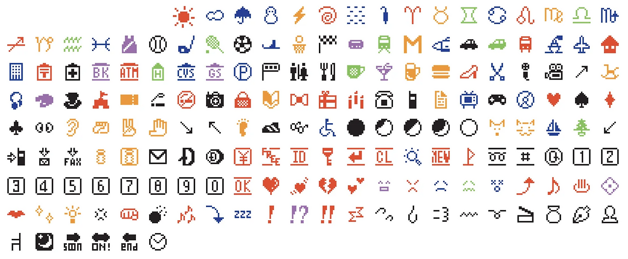 1999년, 일본의 통신회사 도코모는 문자 기반 커뮤니케이션의 한계를 뛰어넘고자 ‘이모지’라는 것을 처음으로 만들었는데요, (더 자세한 이모지 이야기는 예전에 제가 쓴 글이 있습니다.) 시게타카 쿠리타가 디자인한 176개의 이모지 중에서 반짝이는 '새롭고 특별한 것'(Sparkling New)을 상징했다고 합니다. 아래 이미지의 좌측 하단 보시면 자그마한 반짝이를 볼 수 있어요. 176개의 그림 문자를 만들 때 ‘반짝이’가 포함될 수 있었던 것은 앞서 일본에 자리잡은 중요한 대중 문화였기 때문이겠죠. 더 중요한 시각적 상징도 있었을텐데 반짝이가 포함된 것이 참 신기합니다.