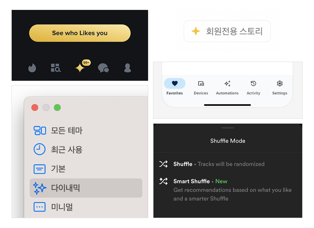 그리고 모든 종류의 번거로운 일을 ‘자동으로’ 해주거나, 개인화된 기능이거나 뭔가를 아주 빠르게 원클릭으로 해주는 기능이라면 반짝이를 붙이게 됐습니다. ‘스마트’가 붙는 기능에도 붙게 됐고, 나중에는 프리미엄 멤버십이나 전용 혜택 등 ‘특별함’을 드러내는 상징이 되기도 했습니다. 이쯤되면 반짝이는 모든 것을 포함할 수 있는 만능 아이콘처럼 보이기도 하네요.