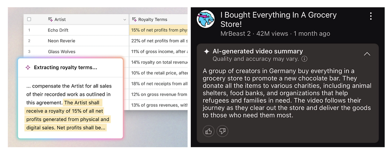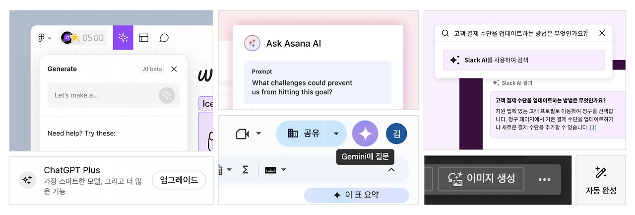 이 흐름이 시작된지 벌써 2~3년이 지난 것 같아요. 2022년 ChatGPT로 인해 IT업계에 대격변이 일어나면서, 대부분의 소프트웨어에 AI 기능이 도입되었고, 디자이너들은 대체 어떤 아이콘으로 AI를 표현할지 고민하다가 반짝이를 선택하게 됐습니다. 그래서 정말 모든 곳에 반짝이가 있죠. Slack과 Asana AI, Figma AI, ChatGPT Plus, 구글 스프레트 시트 AI 요약, 포토샵의 이미지 생성 뿐만 아니라 AI가 있는 곳에는 반짝이가 있습니다.