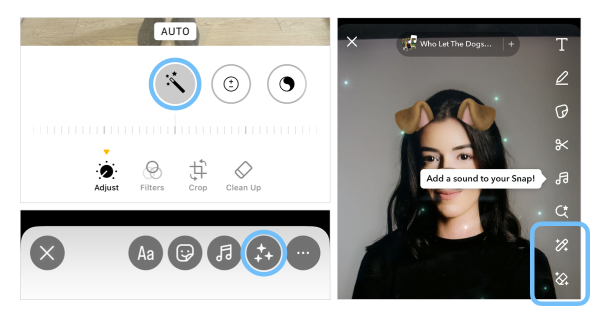 사진 편집의 맥락에서 반짝이는 점점 역할을 확대해갑니다. 자동으로 톤을 보정한다거나, 마법봉처럼 빠르게 선택하게 해주는 등 사용자의 수고를 덜어주는 모든 기능을 상징하게 되었습니다. 여기에 이미지 혹은 영상 편집에 특화되어 ‘필터’를 상징하는 아이콘이 되기도 했습니다.