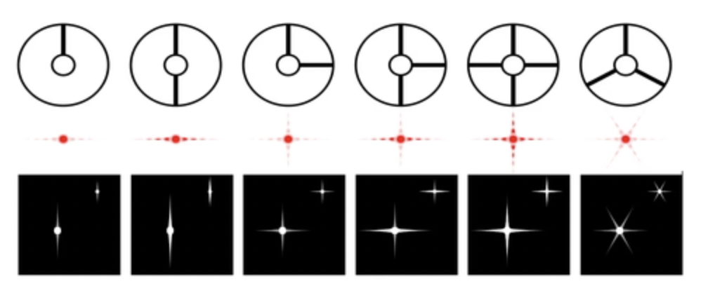 실제로 별이 저렇게 방사형으로 빛나는 것은 아니고요, 빛이 망원경의 지지대나 가장자리와 같은 장애물에 부딪혀 회절되면서 여러 갈래로 쪼개진 것처럼 보인다고 해요. 이를 회절 스파이크(Diffraction Spike)라고 부릅니다. Sunstar 현상, Starburst 현상이라고도 부르고요. 밝은 광원으로부터 방사되는 선의 형태는 보조 거울을 지지하는 스파이더 베인의 수와 배열, 지지대에 따라 달라진다고 합니다. 가지가 4개, 6개로 뻗을 수도 있고 8개로 뻗을 수도 있습니다.
