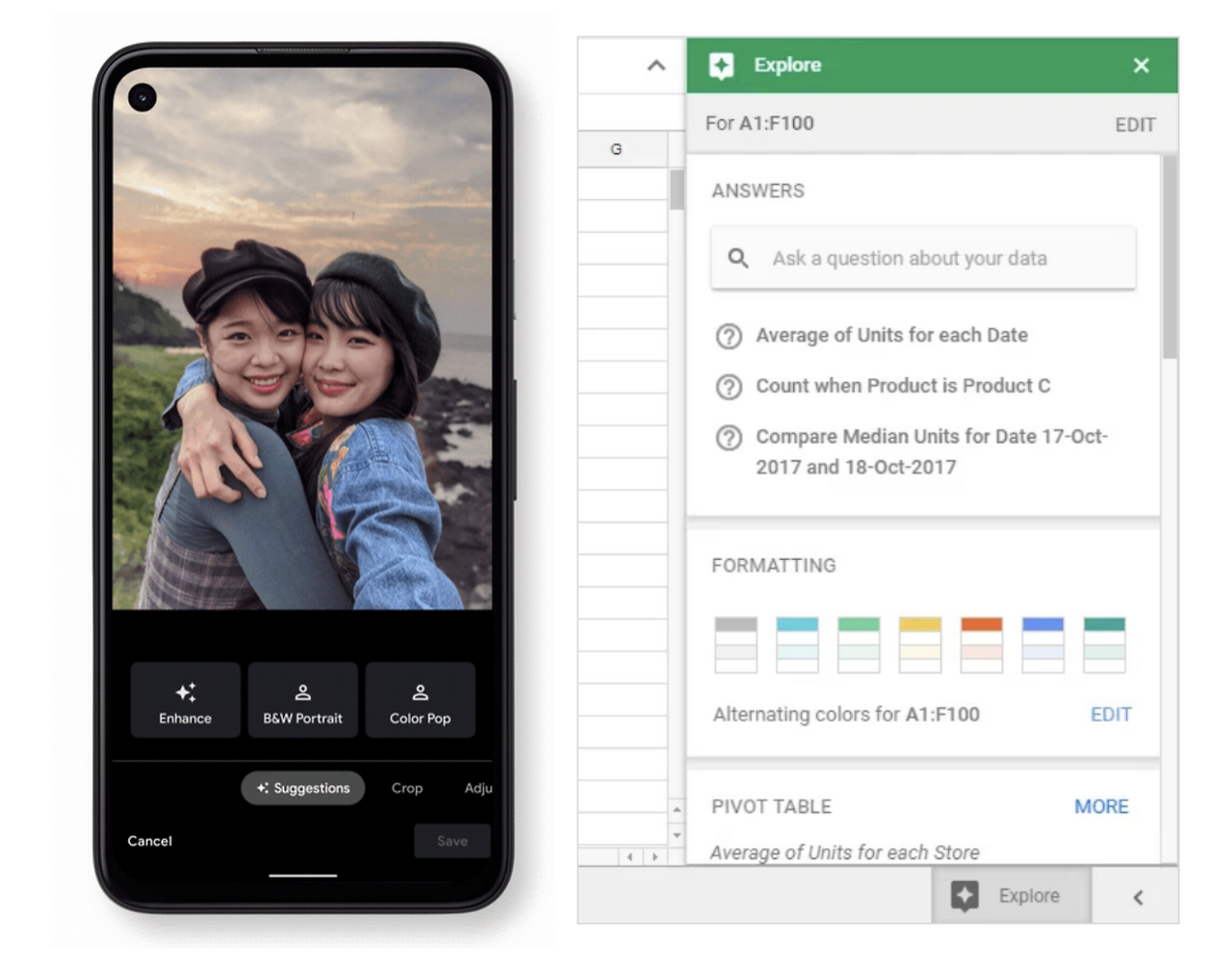 2020년, 구글 포토는 AI 기반 이미지 향상 기능을 선보이며 반짝이 아이콘을 사용했습니다. AI의 복잡한 작동 방식을 일반 사용자에게 설명하는 대신, '마법 같은 일이 일어날 거예요'라고 말하는 게 훨씬 효과적이니까요. 같은 해 구글 스프레트 시트의 'Explore' 기능에서도 머신러닝 기반 주제 추천을 위해 반짝이가 사용됐습니다. 구글이 AI 기능에 대한 시각적 언어를 확립해가는 첫 시도였던 걸로 보여요.