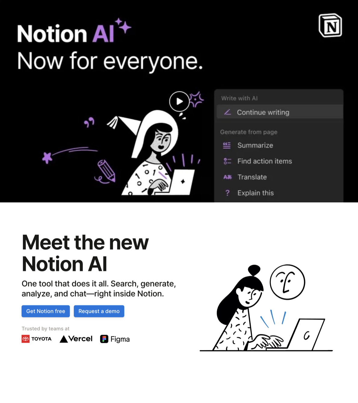반짝이가 줄어드는 흐름은 이미 시작된 것처럼 보입니다. Notion을 예로 들어보면, AI 기능을 출시할 땐 마찬가지로 반짝이 아이콘을 사용했고, 본격적으로 AI 기능을 확장하면서 얼굴 모양의 아이콘을 사용하기 시작했습니다. 물론 세부적인 기능 안에서는 마법봉과 반짝이가 여전히 사용되고 있지만, 얼굴 아이콘을 통해 노션이 추구하는 AI의 모습을 차별성 있게 보여주었습니다. (갑자기 노션 칭찬ㅎㅎ)