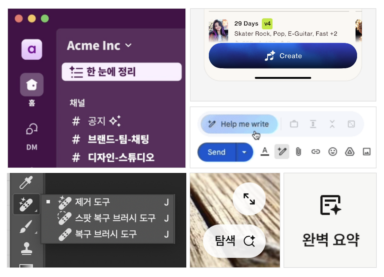 이러한 모호함을 해결하기 위함일까요, 최근에는 반짝이를 단독으로 사용하는 것보다는, 다른 아이콘과의 결합해서 쓰이는 것을 자주 보게 됩니다. Gmail에서는 AI로 이메일 쓰는 기능에 펜과 반짝이를 결합했고, Photoshop에서는 '제거 도구'를 표현할 때 반창고와 반짝이를 합친 형태를 사용합니다. Slack의 AI 요약 기능은 리스트 아이콘과 반짝이가 합쳐진 형태를 사용합니다. 돋보기에 반짝이, 음표에 반짝이, 문서에 반짝이 등 기존의 수많은 아이콘과 반짝이가 결합되고 있습니다. 이는 기능의 성격을 약간은 더 명확하게 전달하면서도, AI 기능임을 은유적으로 표현할 수 있겠네요.