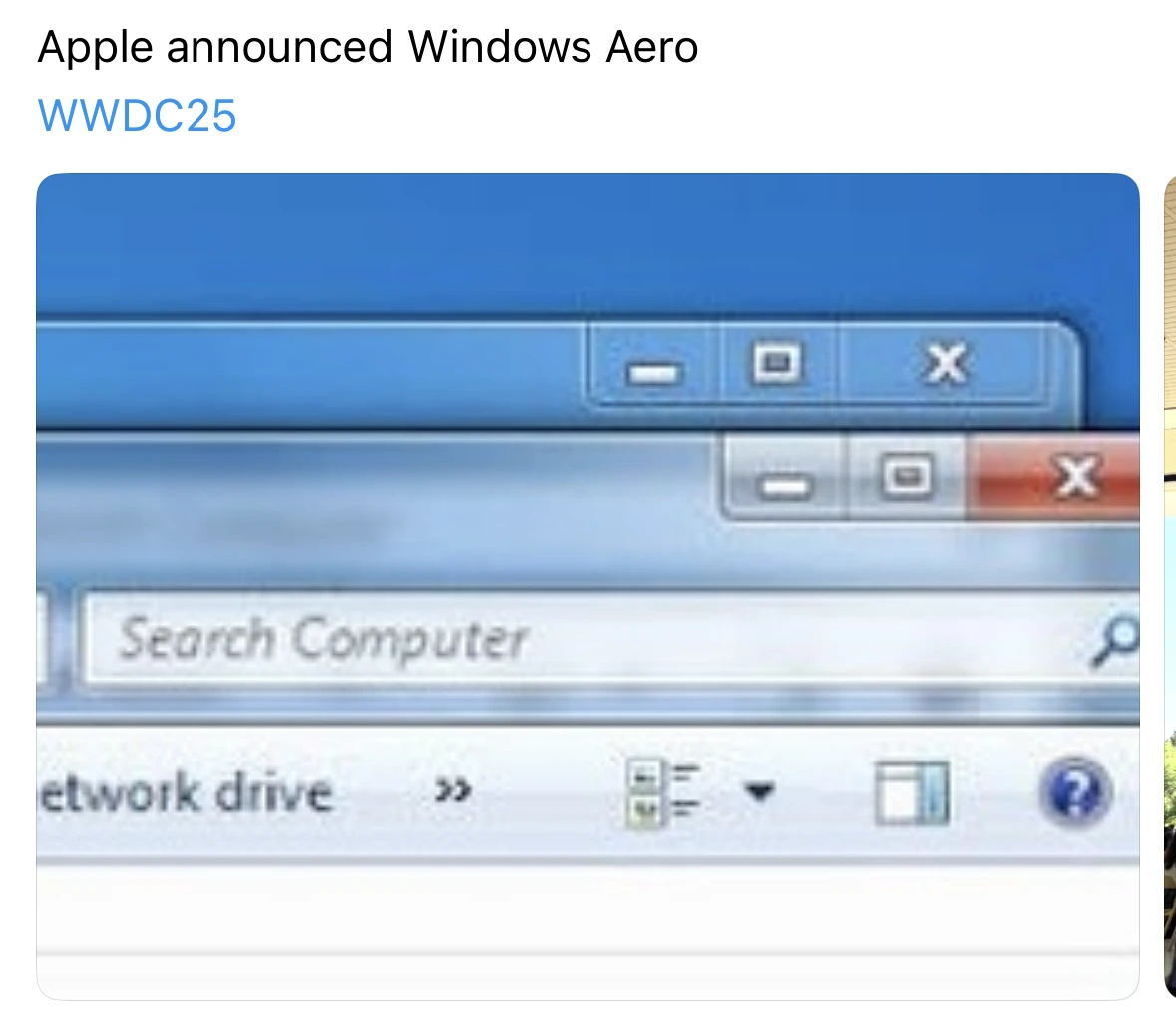 이번 WWDC25에서 발표한 리퀴드 글래스(Liquid Glass)가 화제다. 리퀴드 글래스는 물리 세계에 존재하는 액체의 유동성과 유리의 투명성을 디지털 세계에 옮겨온 컨셉이다. 현재 접근성을 포기했다는 지적, 윈도우 비스타 에어로의 재탕이며 사치스러운 디자인이라는 비판이 이어지고 있다.