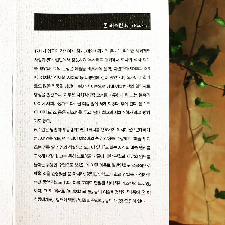 같이 서성일 게 필요해 책장에서 손에 잡히는 대로 빼들고 보니 언제 샀는지도 기억나지 않는 존 러스킨의 드로잉. 19세기에 쓰인 드로잉 책을 펼쳐들고 집안을 어슬렁거린다. 이 모습을 남편이 본다면, “진짜 궁금해서 묻는 건데 아이방 옆방이 창고가 아니라 방, 그것도 당신 방이라는 거 알지,” 그 당연한 걸 아느냐고 그는 진짜 궁금한 듯한 표정을 하고서 며칠 전에 물었듯이 또 물을지도 모른다. 왜냐하면 내 방을 제외한 집안 곳곳을 종종 배회하기 때문이다. 오늘처럼.