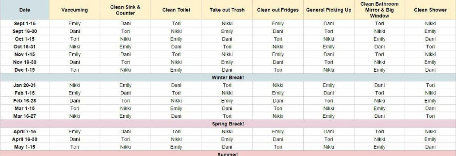그리고 다음 안건은 '식탁 청소 잘하기', '설거지 제발 미루지 말기'. 누군가가 설거지 더미에서 fly를 봤다고 했는데 나는 딴생각하면서 못 듣고 있다가, '뭐 무슨 벌레가 나왔었다고?" 하면서 경악했더니 애들이 또 날 보고 웃었다. 우리 플랫은 부엌 냉장고에 일주일마다 돌아가면서 각자 해야 할 집안일이 표로 정리되어 붙어있다. 재밌는 건 돌아가면서 쉬는 주도 있다는 것이다. 우리는 lucky week라고 부른다. 이 표는 내가 기숙사에 배정되었을 때부터 있었고, 우리는 초기에 같은 방식을 사용하자고 합의했고 매번 새로운 표를 잉이 주기적으로 만들어 붙인다. 누군가가 길게 플랫을 비우는 경우, 집안일에 공백이 생겨서 사람이 살 수 없는 지경이 되기 때문에 긴 공백이 생기는 경우 미리 플랫 메이트들에게 말해둔다. 우리 플랫은 쓰레기 버리기, 화장실1청소, 바닥청소, 부엌 청소, 화장실2청소 집안일이 있고, 자신이 요리한 부엌과 식탁은 직접 치우는 게 원칙이다.