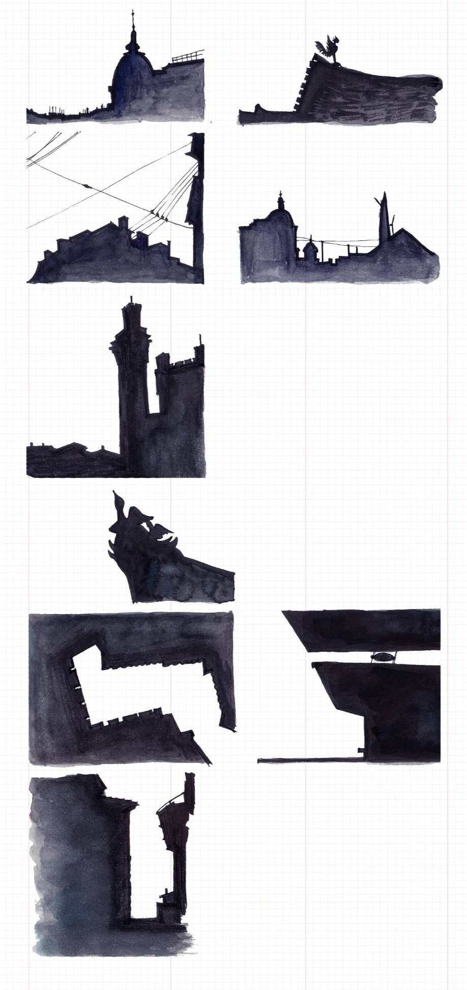 건축의 단면, 부재의 틈, 어딘가에서 잘려 나와 떠돌던 형상들이 하나의 선, 하나의 윤곽을 이룬다.