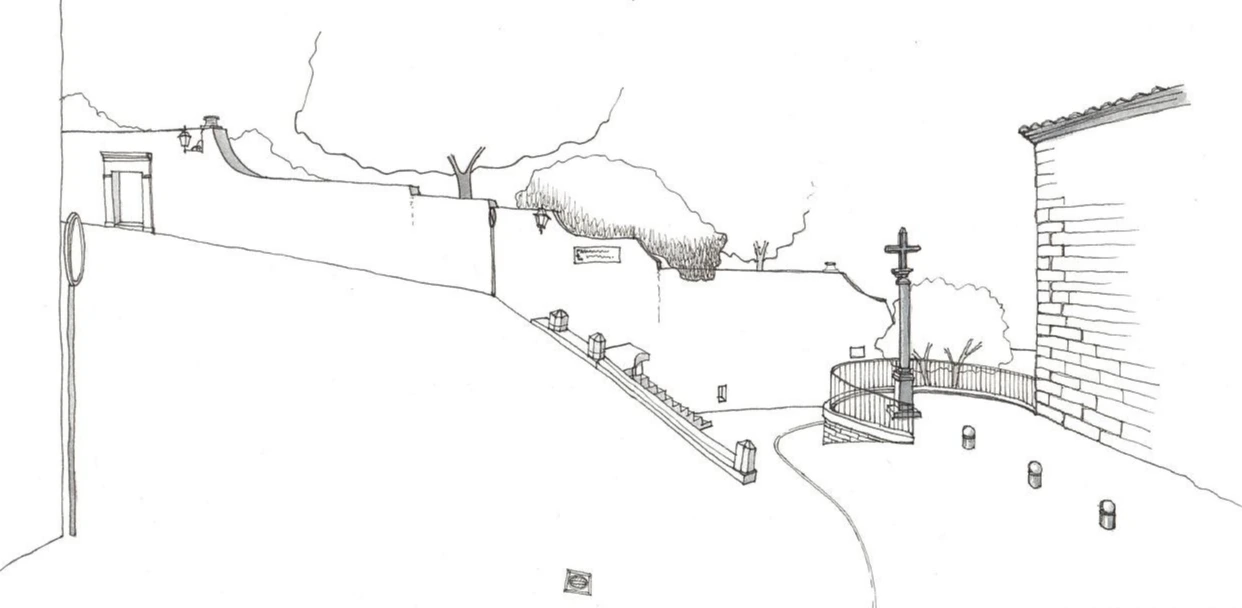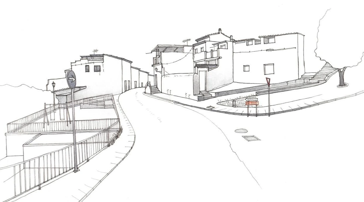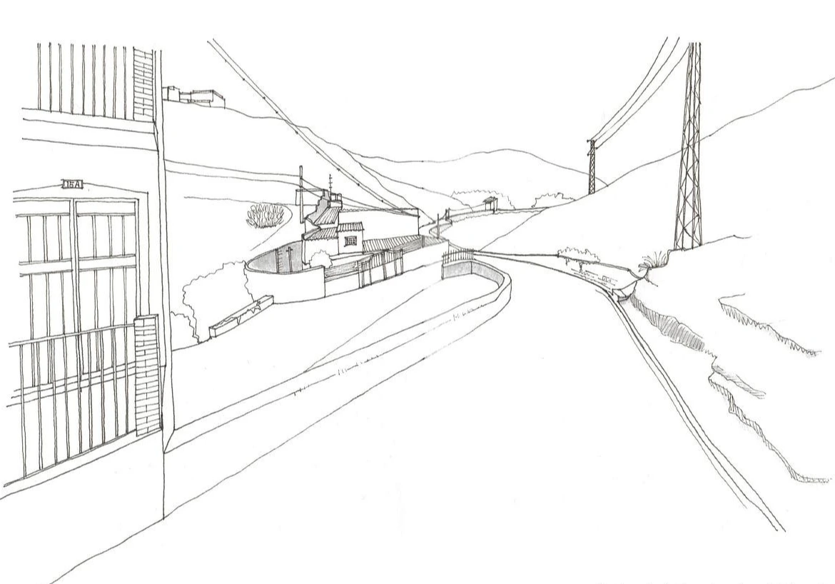도로의 한쪽 편은 드문드문 떨어져 있는 건물들에 맞춰 파라펫, 담, 벽으로 가장자리를 따라 모스부호처럼 연결과 끊김의 반복으로 흐름을 이어가고 있다.